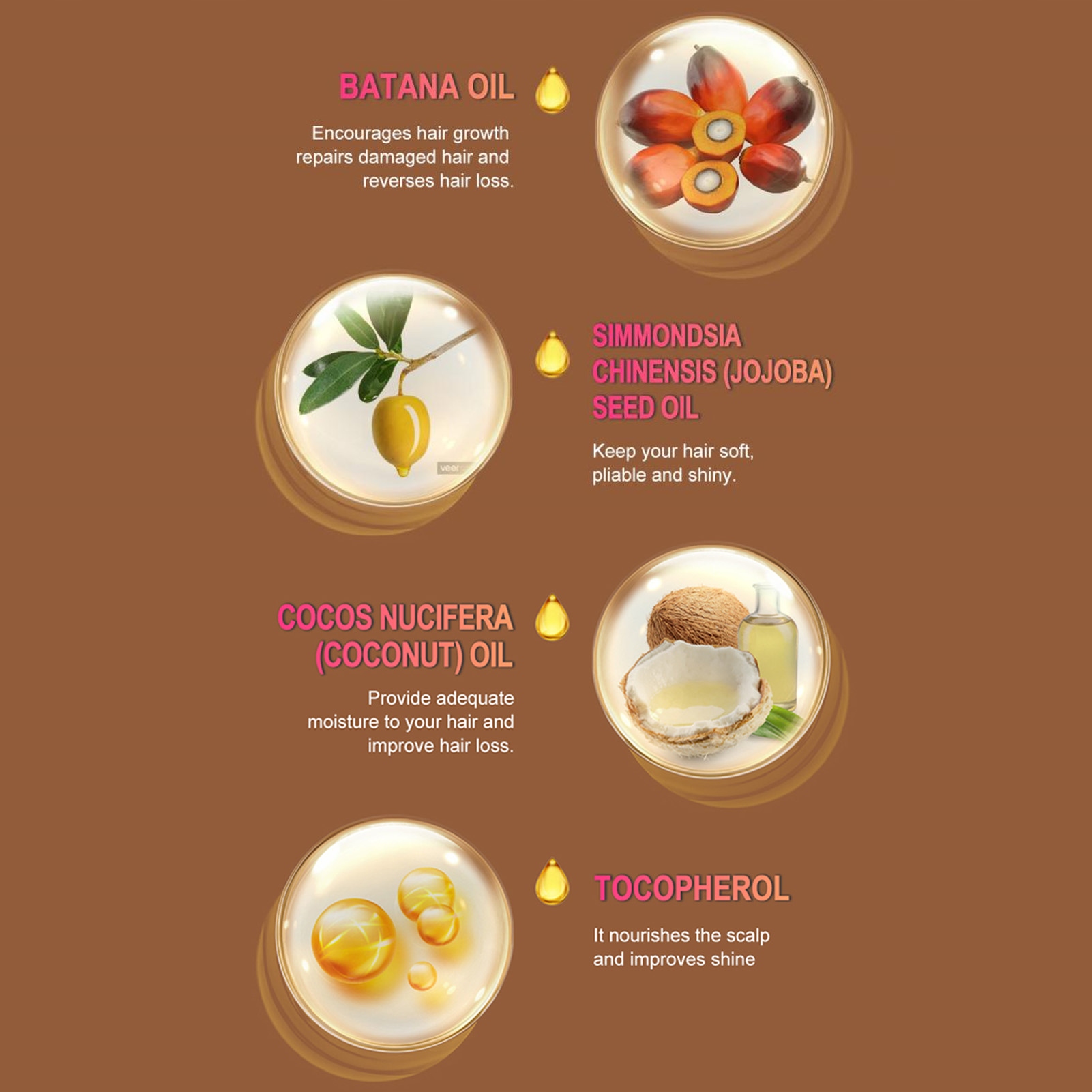 1. Укрепление: маска для волос с маслом батана, обеспечивающая необходимые питательные вещества для поддержки роста волос и уменьшения их сухости, уменьшения ломкости волос и содействия их здоровому росту.