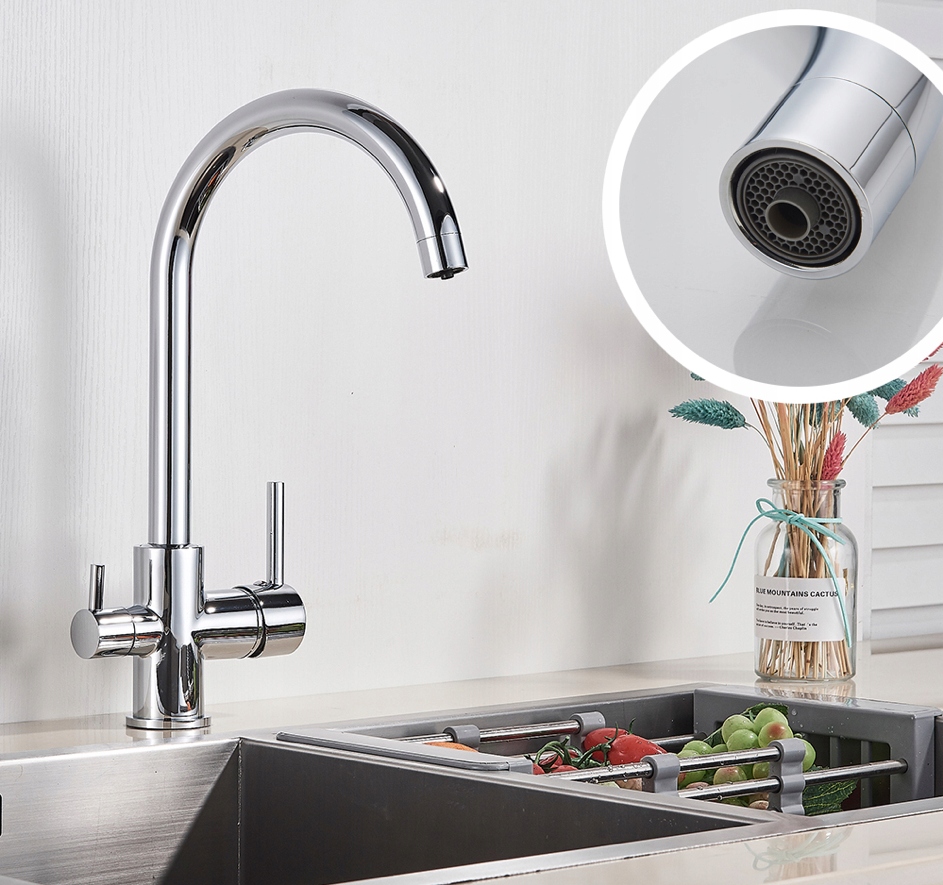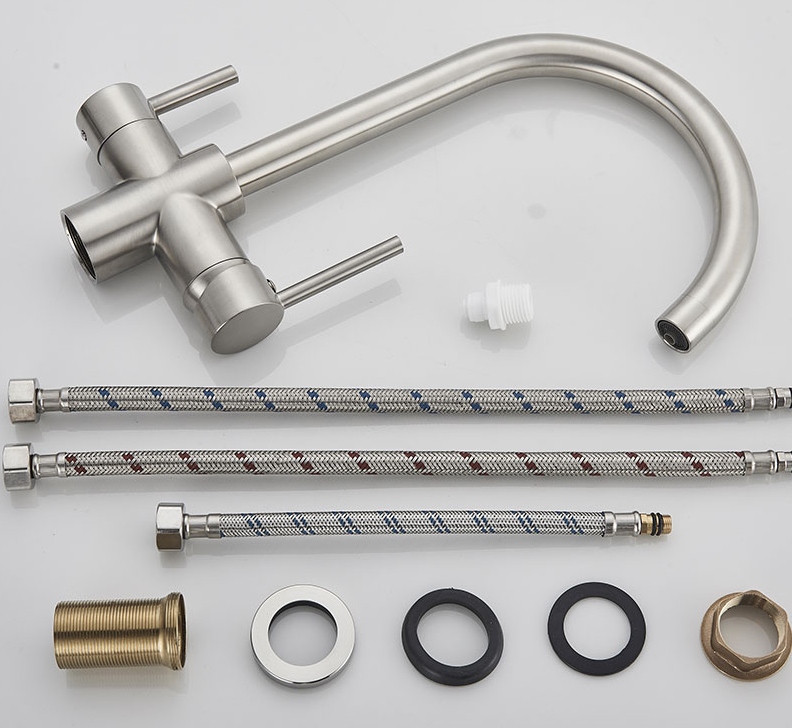 Она оснащена двумя независимыми цепями. Первый отвечает за подачу горячей и холодной воды. Второй позволяет подключиться к фильтрованной воде. Благодаря доступу с двух независимых каналов трехходовой смеситель делает необходимым использование дополнительного крана у фильтра для воды.