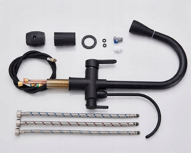 Оснащен двумя независимыми контурами. Первый отвечает за подачу горячей и холодной воды. Второй позволяет подключение к фильтрованной воде. Благодаря доступу из двух независимых каналов трехходовой смеситель исключает необходимость использования дополнительного крана для фильтра для воды.