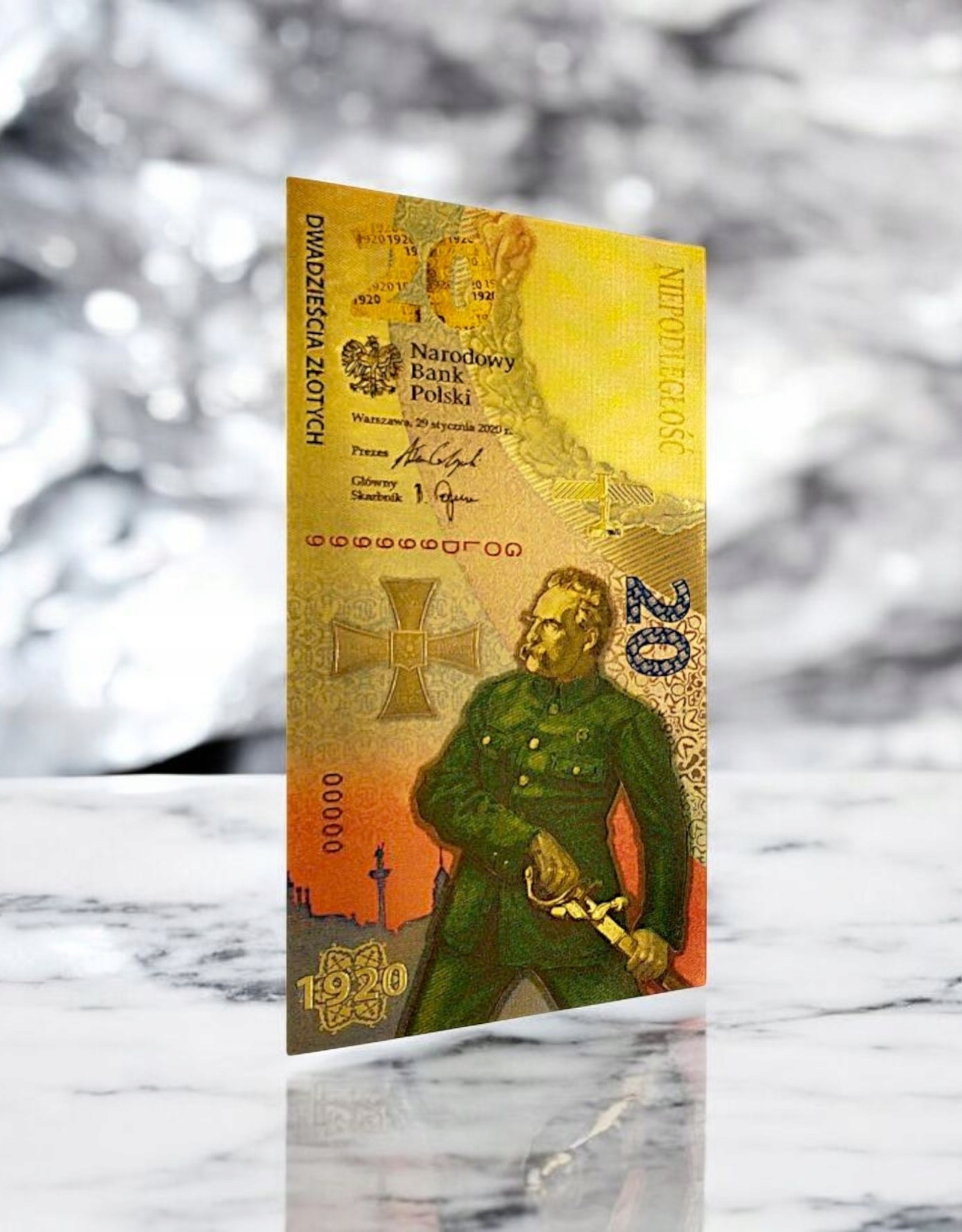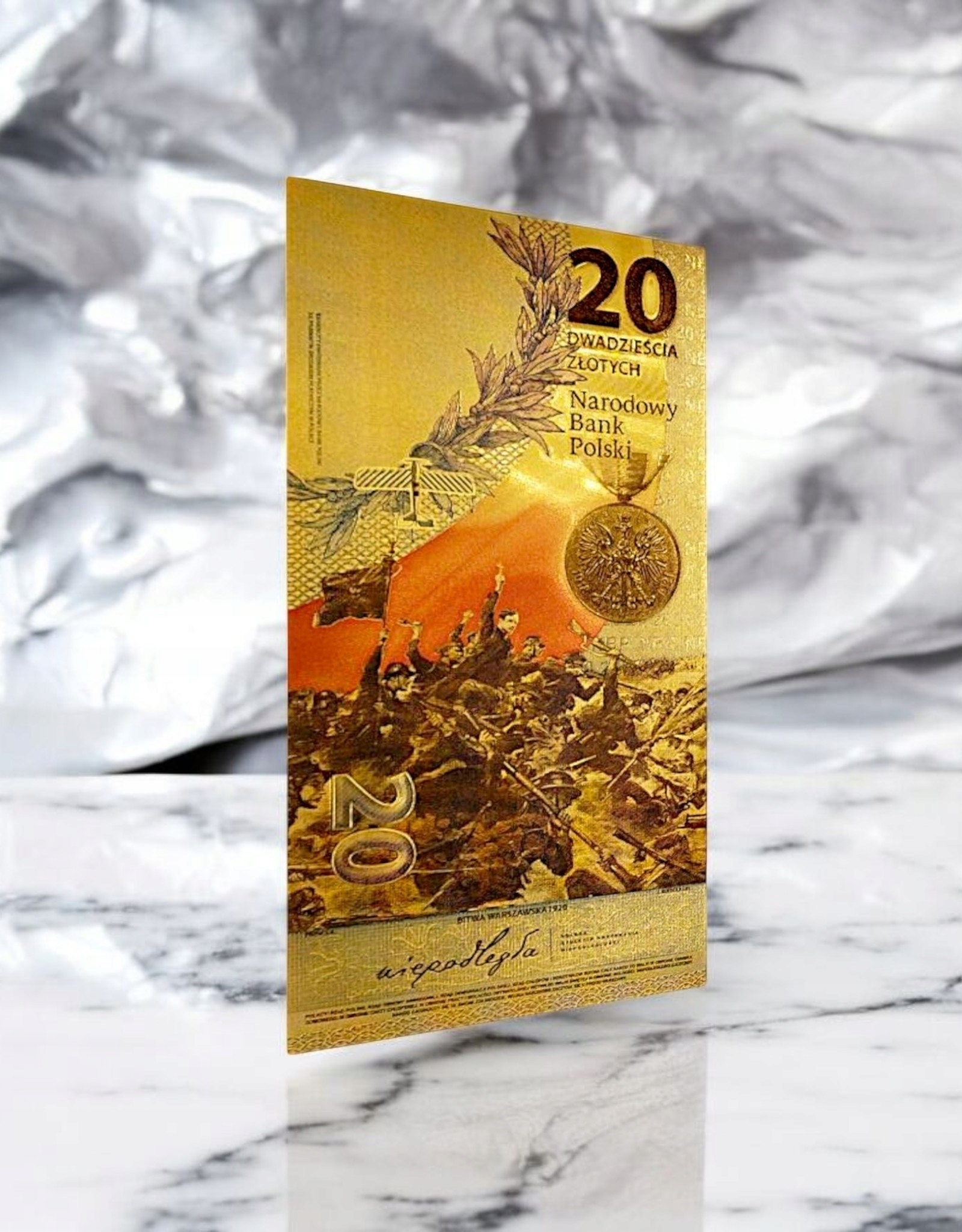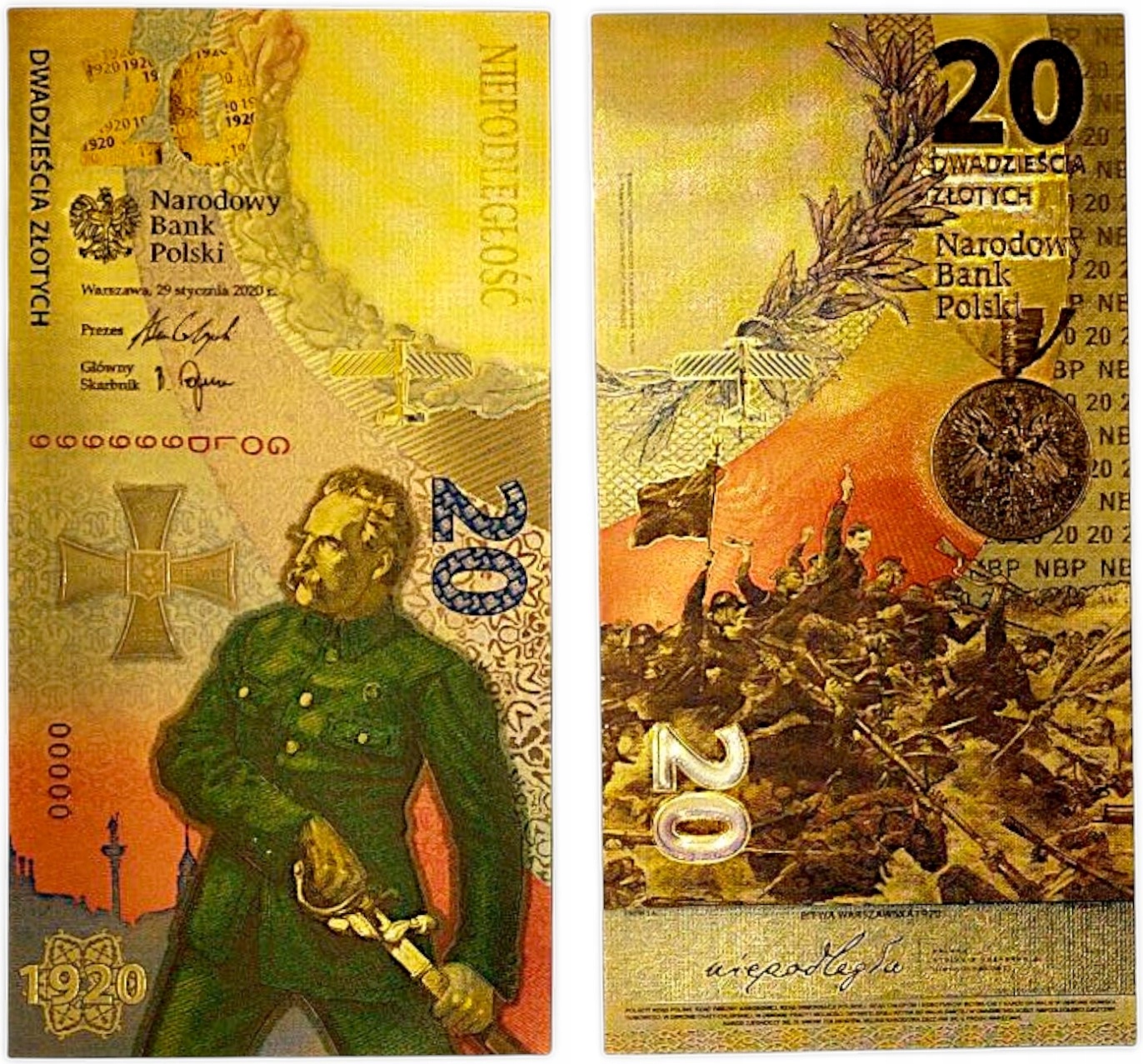 ⭐Коллекционная банкнота номиналом 20 злотых, изготовленная из высококачественного ПВХ и покрытая благородной золотой фольгой, с изображением маршала Юзефа Пилсудского и мотивом Варшавской битвы 1920 года – одного из важнейших событий в истории Польши и Европы.