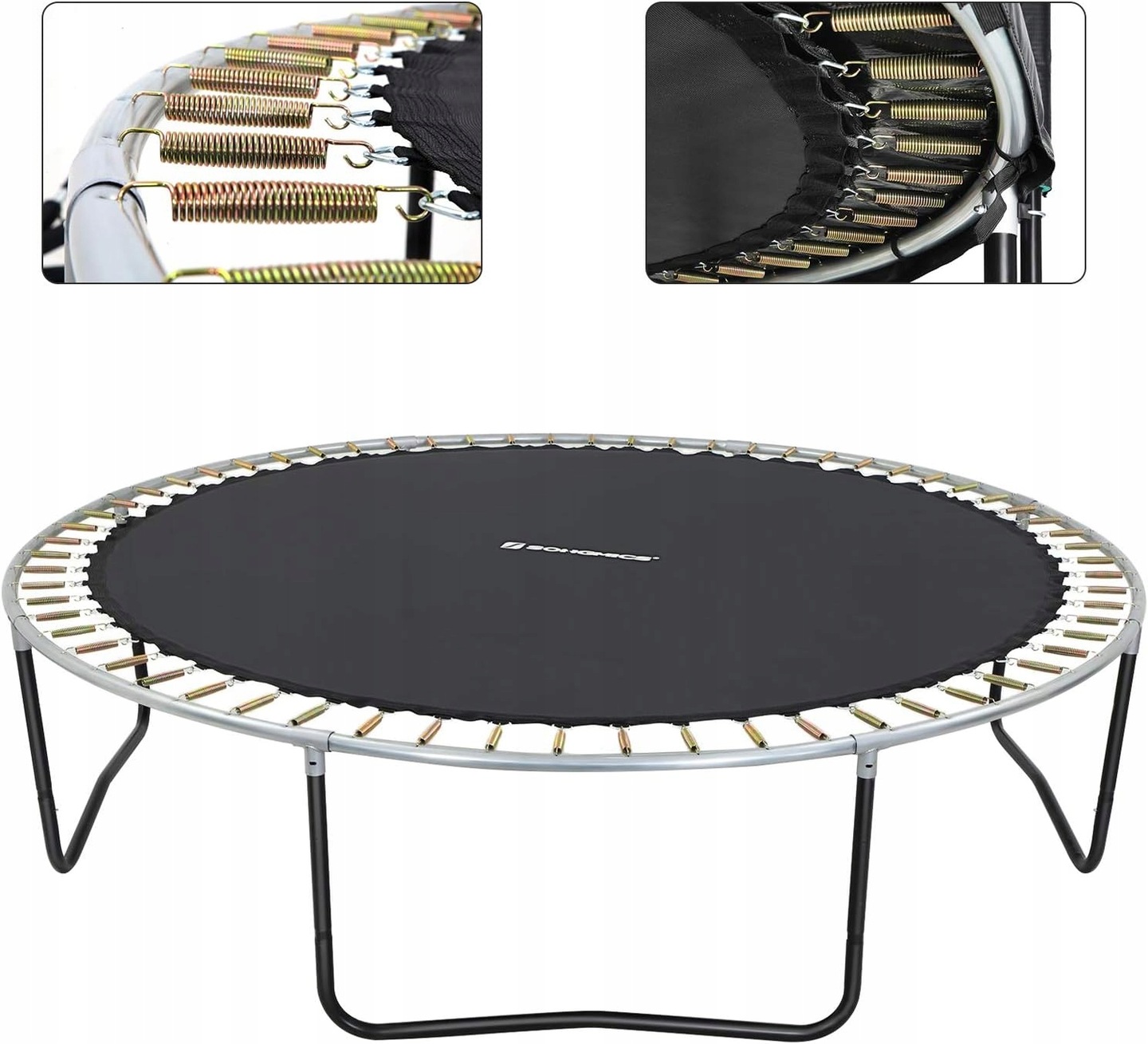 Коврик оснащен оцинкованными, v и железными кольцами с прочным, полиэфирным ободом b>. Эти элементы предоставляются надежным, плотным и безопасным подключением с батутной рамой.