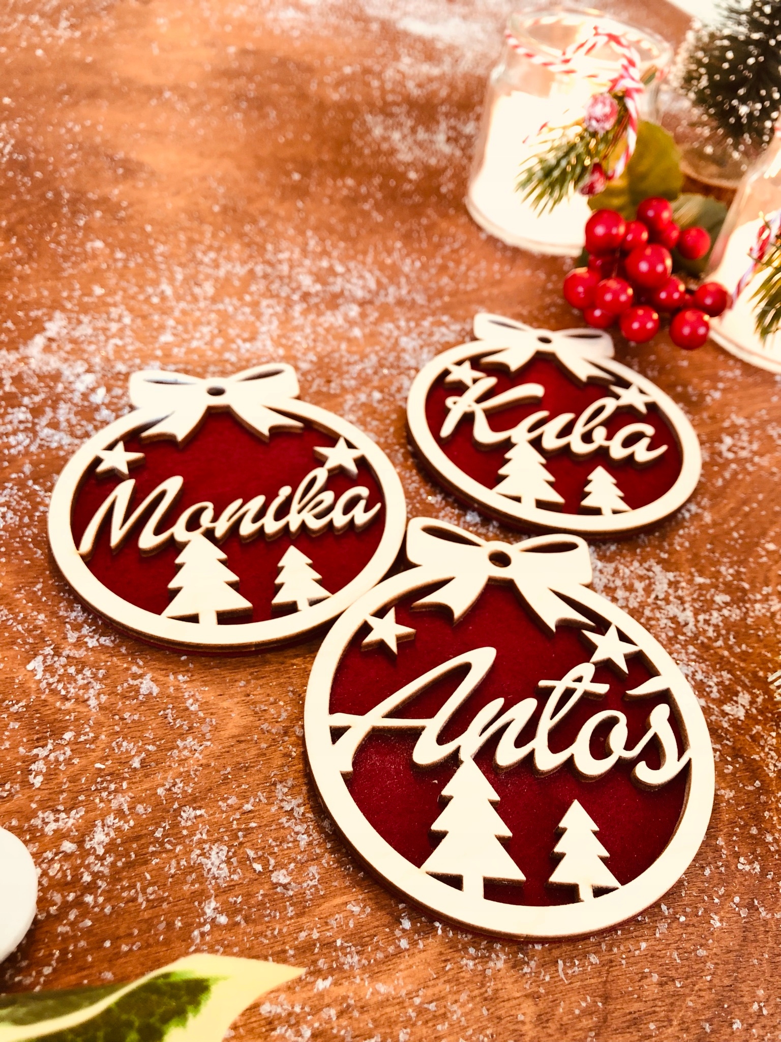 Мы представляем красивые деревянные рождественские безделушки с именем. Дополнительное украшение - это шерсть, ощущаемая в Burgundy цвете.