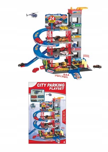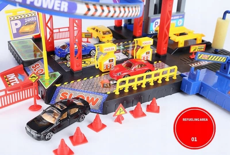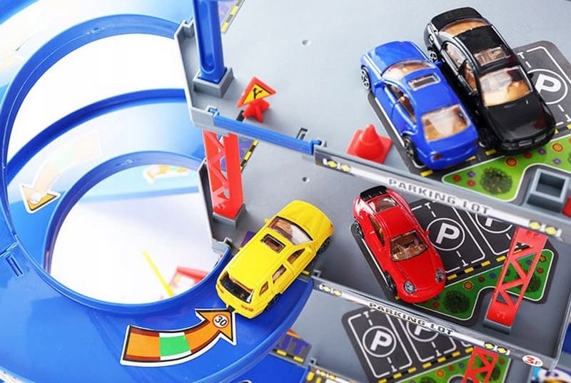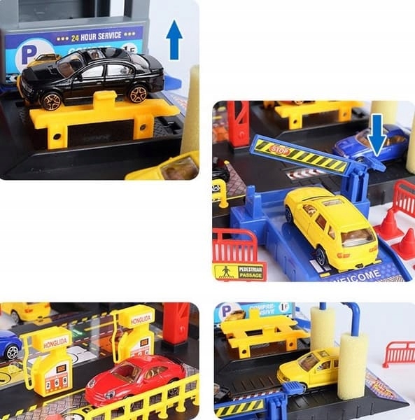 Парковка имеет отдельное направление движения и парковочные места, а также набор также включает барьеры, дорожные знаки и предупреждающие конусы, которые могут быть свободно развернуты.