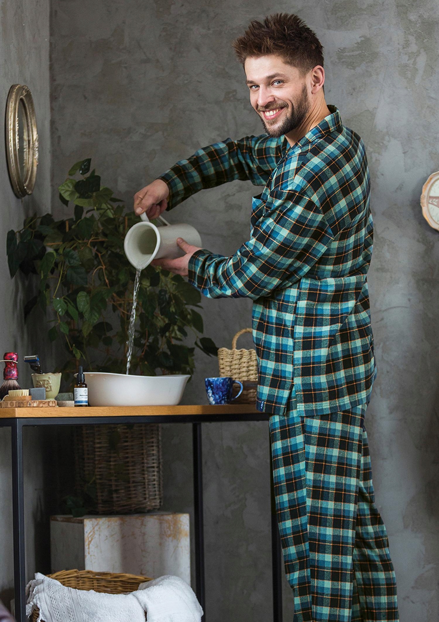 Мужская фланелевая пижама в зелено-оранжевую клетку обеспечивает комфорт и тепло. Классическая форма пижамы, застегивающаяся на пуговицы, с воротником и карманом. Длинные брюки с карманами и нестягивающим эластичным поясом.