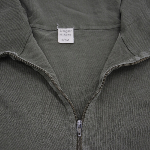 Оригинальная облегающая футболка Бундесвера с длинными рукавами. Выполнена в оливковом цвете (оттенок может отличаться от модели, представленной на фото). Имеет высокий воротник на молнии. Рукава заканчиваются манжетами.