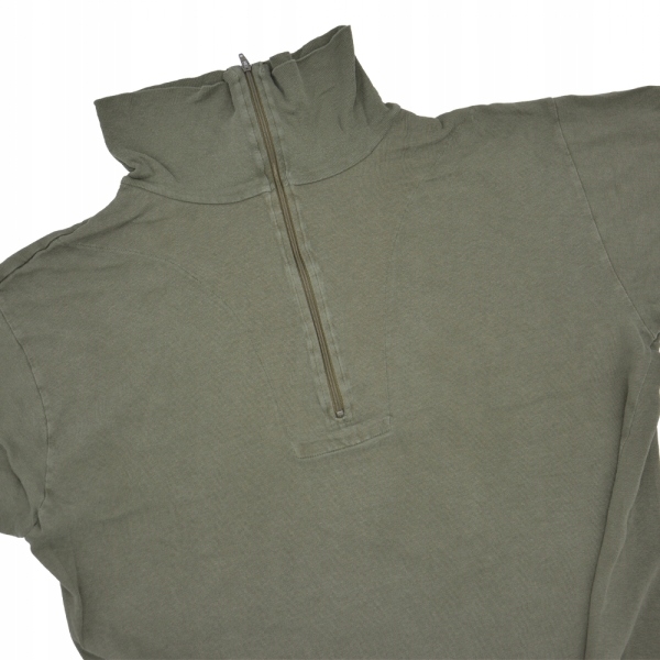 Оригинальная облегающая футболка Бундесвера с длинными рукавами. Выполнена в оливковом цвете (оттенок может отличаться от модели, представленной на фото). Имеет высокий воротник на молнии. Рукава заканчиваются манжетами.
