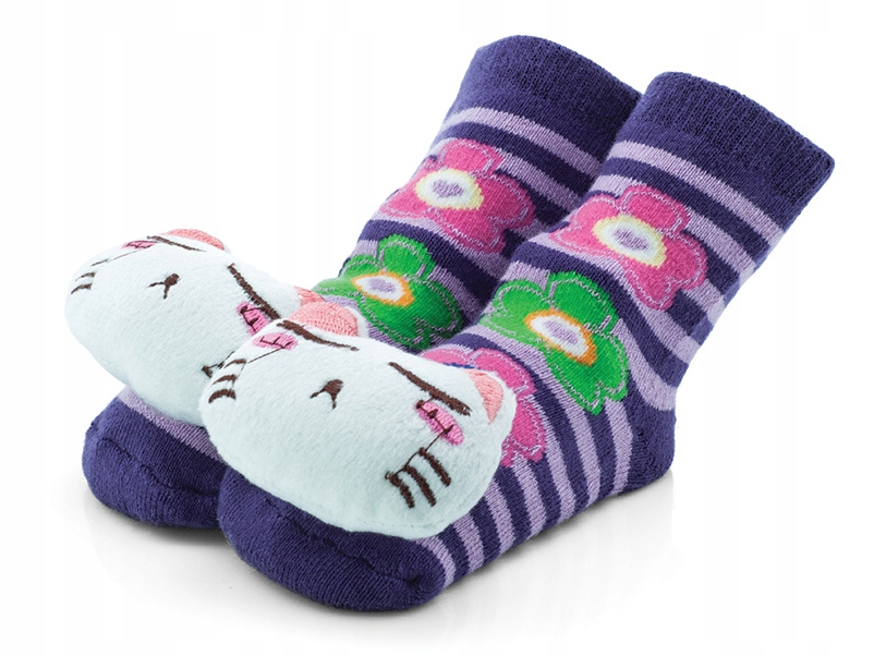 Носки хлопчатобумажные для детей от года с погремушкой, спрятанной внутри животного, пришитой над пальцами ног. Противоскользящая система обеспечивает безопасные шаги маленьких детей по любой поверхности пола.