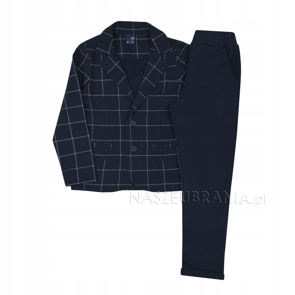 - Цвет: темно-синий пиджак в белую клетку, темно-синие брюки.
