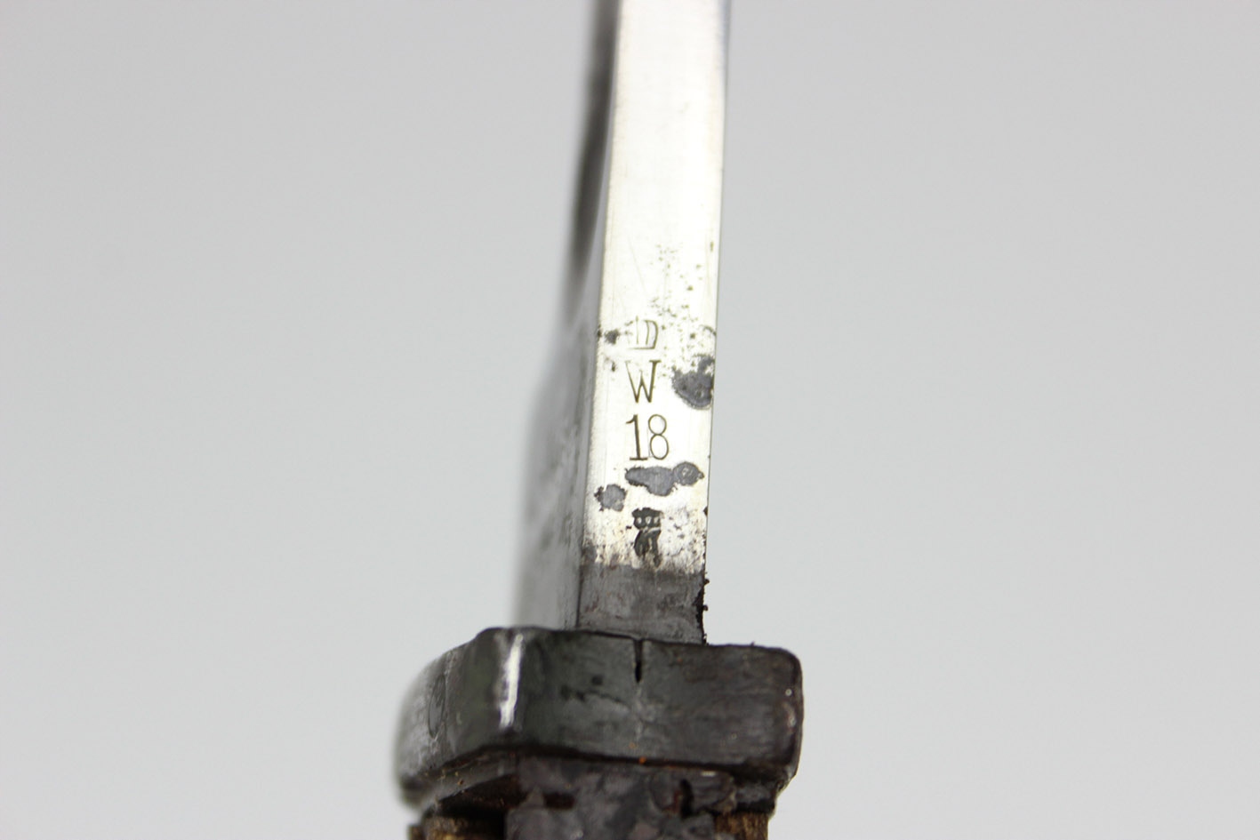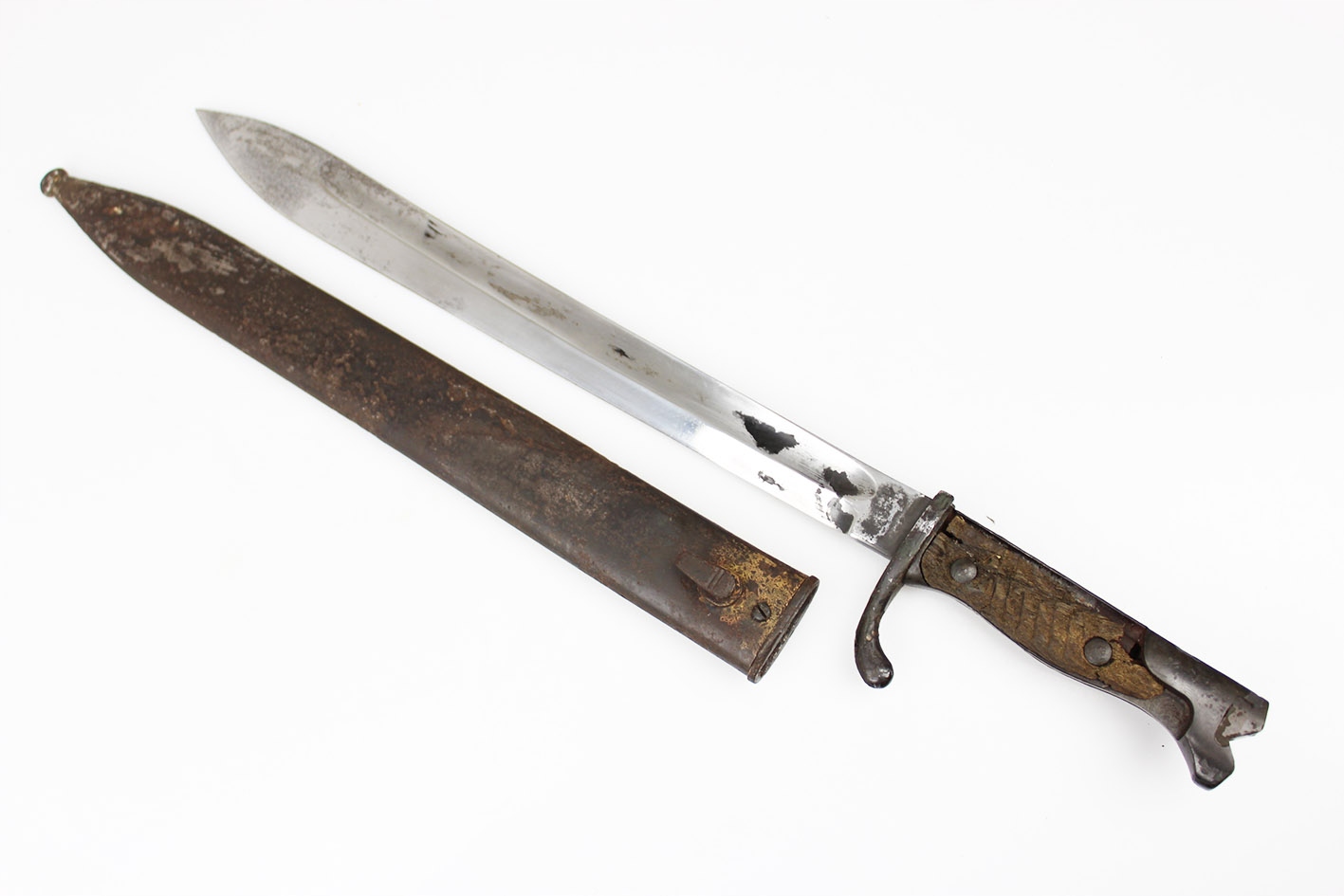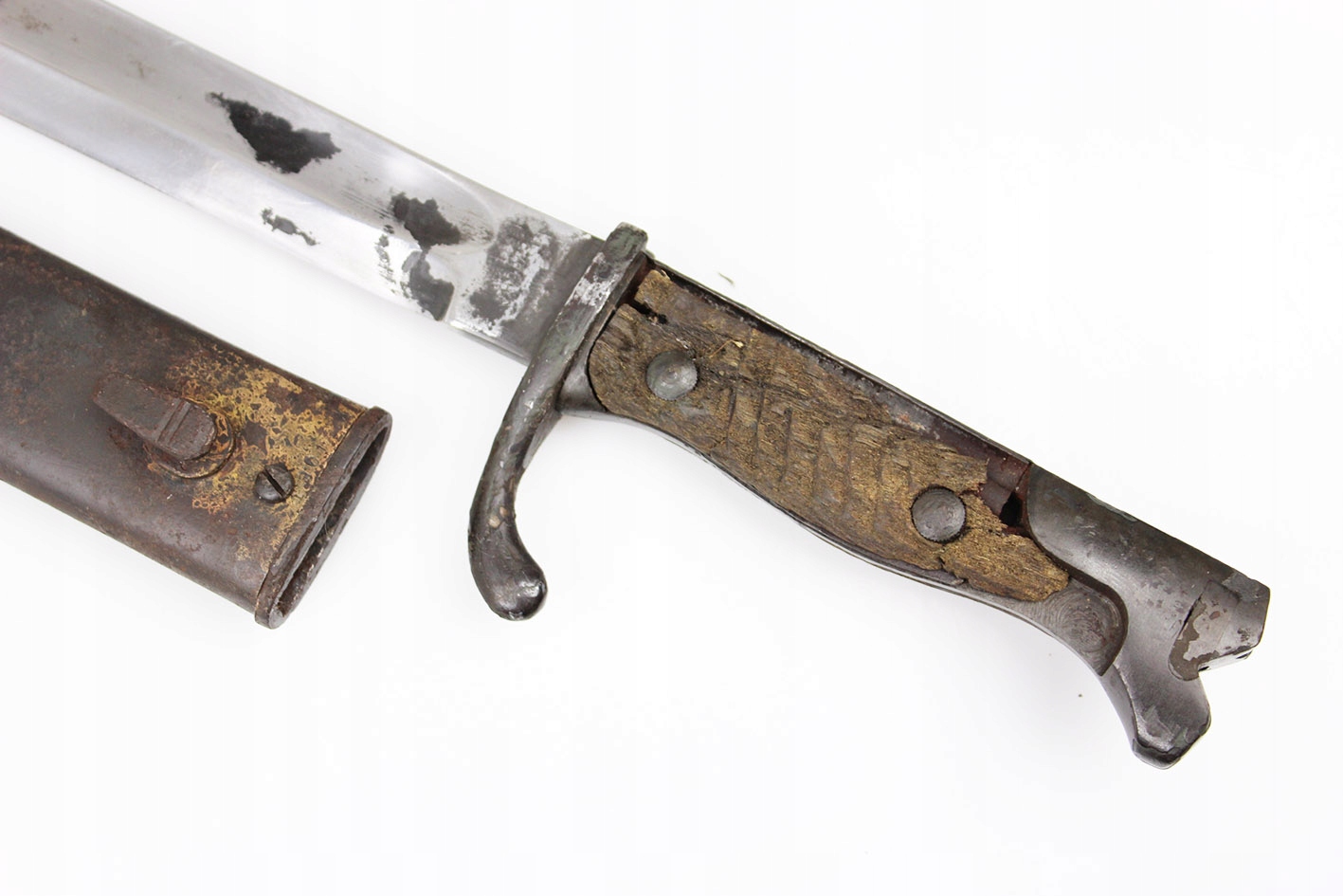 Редкая версия прусского байонета Mauser S98/05 для получения в 1918 году на растениях Holler Solingen. Согласно положениям мирного договора в Версале (28 июня 1919 года), Германия была в значительной степени разоружена, и некоторые из обычно военного оружия отправлялись в полицию после модификаций. Это также имеет место с представленным штыком, который в результате разрезания ручки (v-cut) и шлифования фиксирующей защелки стала лишь оружием адъютанта. На влагалище видимых подписей принадлежности к конкретной полицейской подразделений. Один облицовка в плохом состоянии, но все время, влагалище с сильным удушьем, без отверстий. Что именно на картинках.