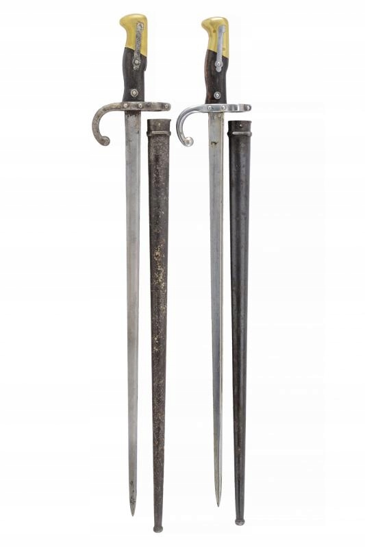 Французский штык (на первом фото/миниатюре тот, что справа) к винтовке Гра; Mle1874 Мануфактура Шательро, июнь 1877 года. Отличное состояние; В ножнах держится крепко, пружина/защелка работает плавно. Ножны сохранили первоначальное окисление и находятся в отличном состоянии.
