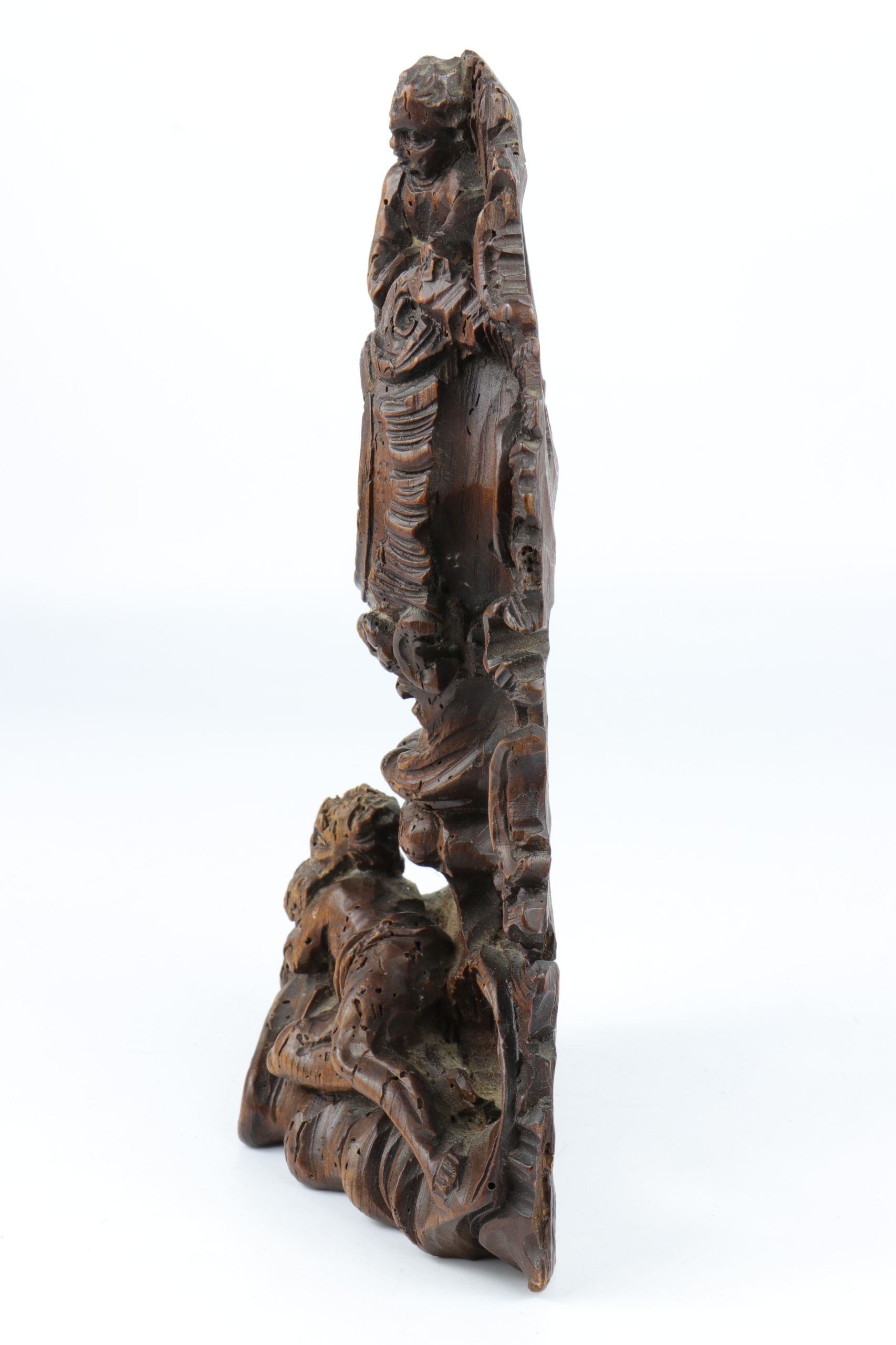 Резная деревянная основа в стиле рококо для карманных часов. Паз для часов достаточно широк для более крупных часов 18 века. На фотографиях стенд с часами 19 века. Дерево украшено двумя фигурками старика и маленького мальчика, аллегорически символизирующими течение времени.
