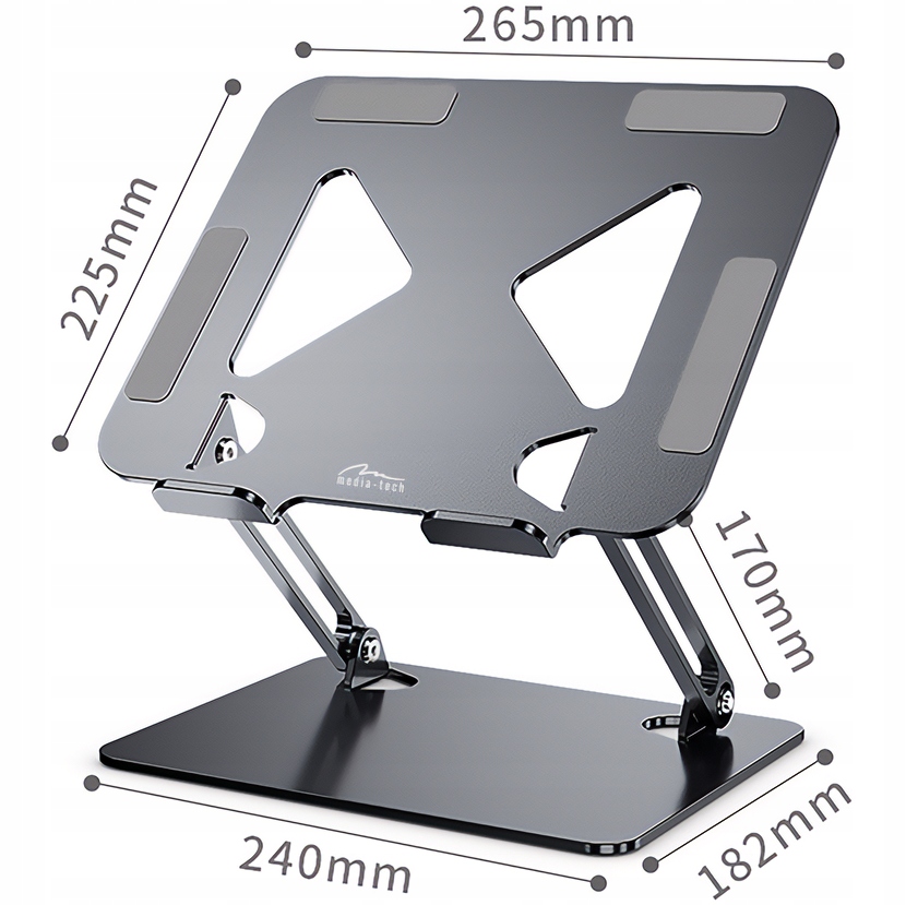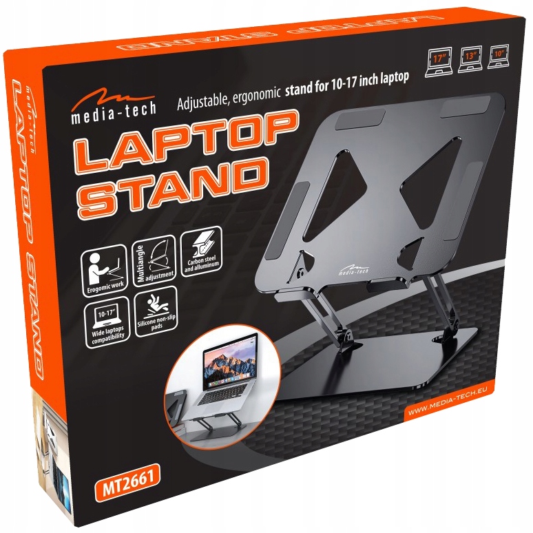 Стенд ноутбука Standtop Standtop Stand Stand Mt2661 Ноутбук от Media-Tech-это решение, которое значительно улучшит комфорт и эффективность вашей работы. Благодаря этому ваш ноутбук будет на идеальной высоте, который уменьшит груз шеи и спины, принесет облегчение в течение долгих часов, проведенных перед экраном.
