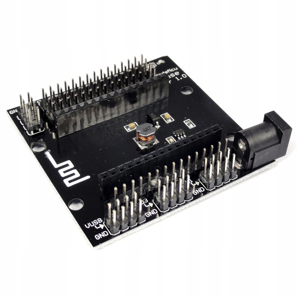 Шилд для ESP8266 NodeMCU V3. Плата имеет встроенный стабилизатор 5 В/1 А, разъем питания постоянного тока 5,5/2,1 мм и светодиод, указывающий наличие питания системы. По бокам расположены контакты для всех разъемов микроконтроллера, а на противоположной стороне — контакты напряжения.