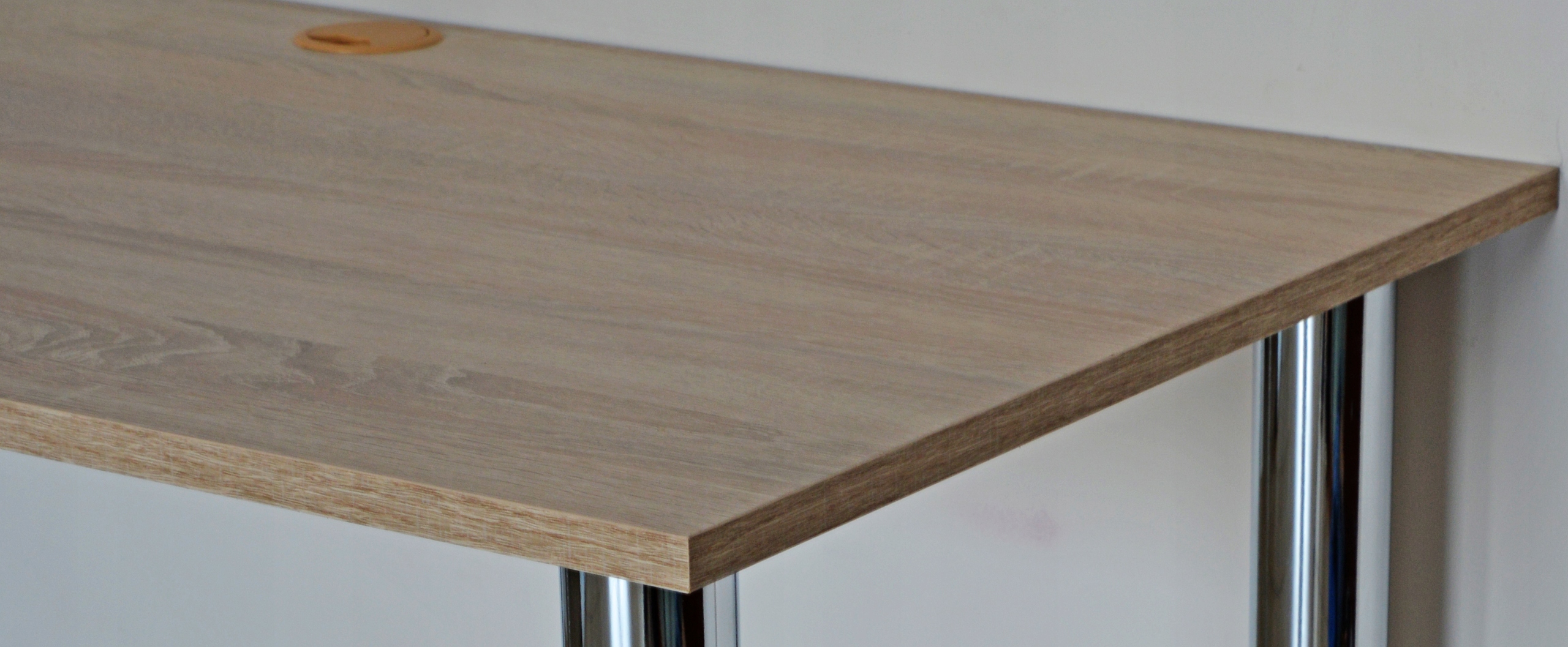 - Толстый верх — ДСП толщиной 18 мм, покрытый специальным ламинатом с шероховатой структурой. Интересный дизайн сочетается с высокой устойчивостью и долговечностью всего стола.