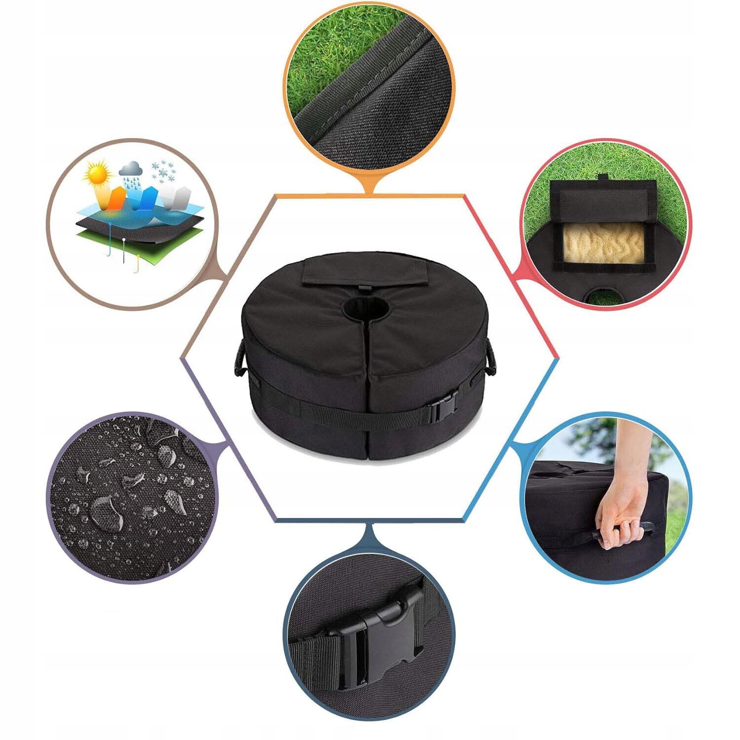 ✔ Большое отверстие для легкого заполнения: Большое отверстие, легко наполнение песком без проблем. С несколькими мешками с песком вы можете увеличить или уменьшить вес зонтика в зависимости от ваших потребностей. Затем прикрепите его к поперечному основанию, чтобы отрегулировать положение зонтика.