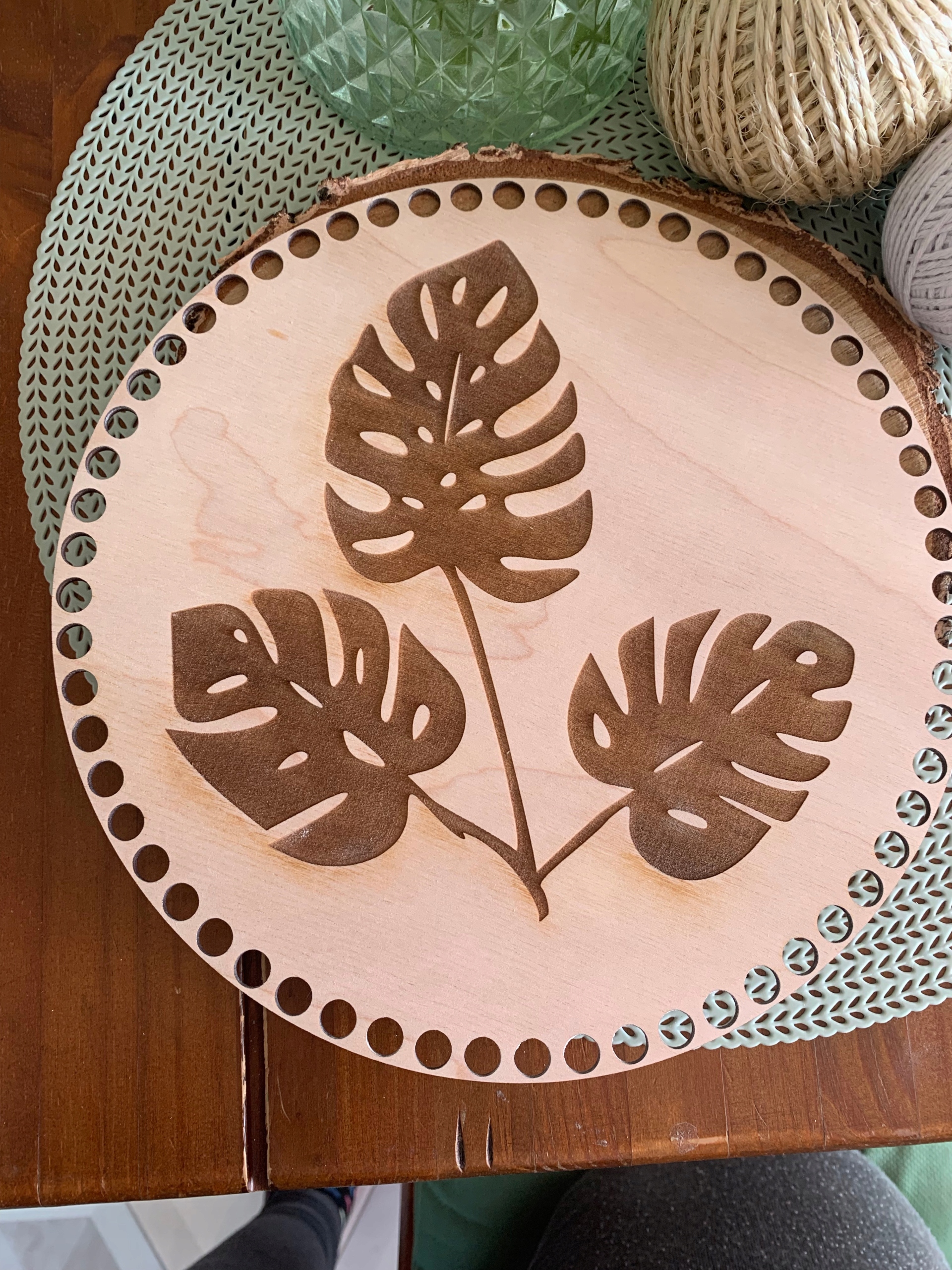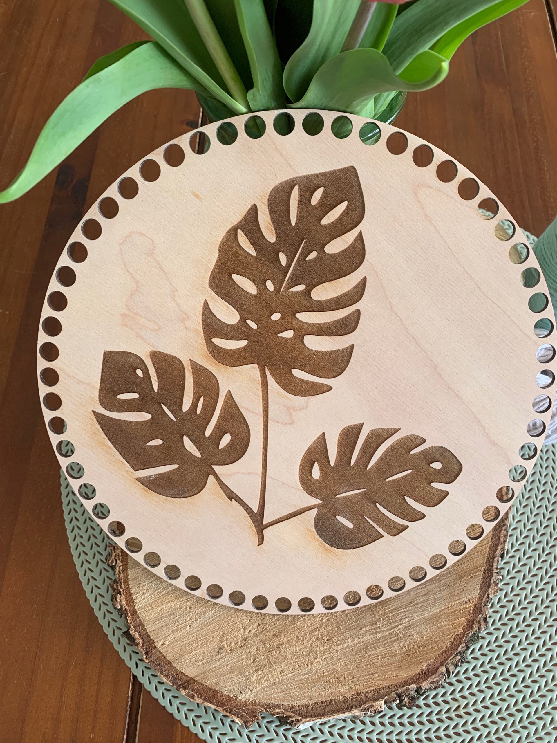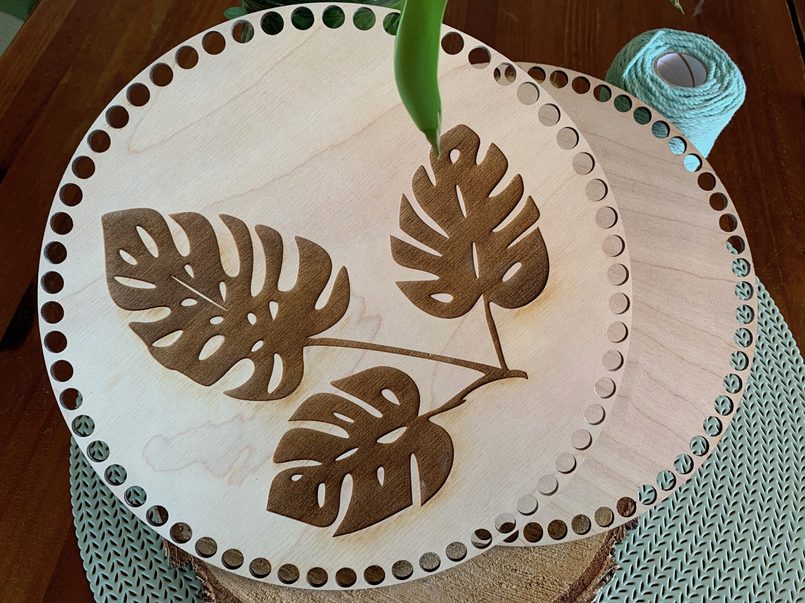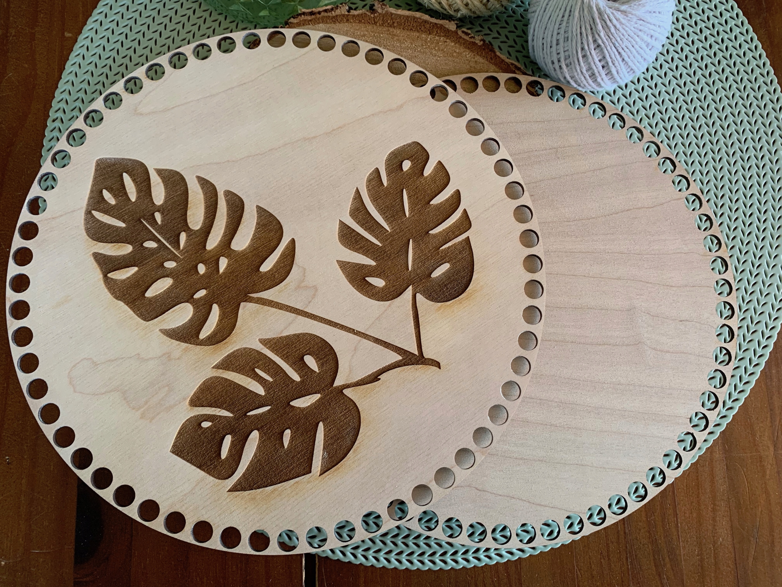 Предмет продажи - комплект из двух основ для дна и крышки корзинки макраме или крючком в форме круга с выгравированным узором монстера.< /h1>