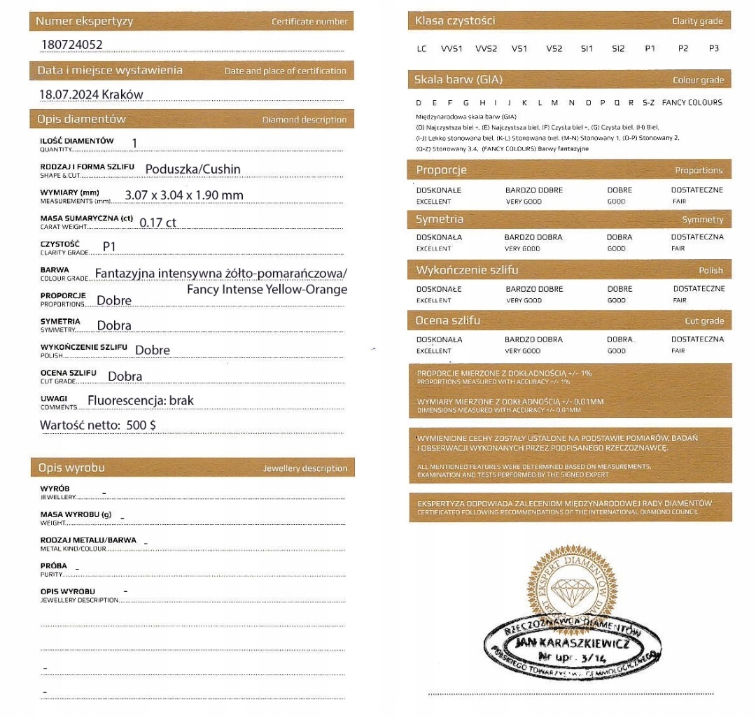 b>сертификатомОценщика Польского геммологического общества компании Diamond Sky, работающей на польском рынке 30 лет (в разделе для установки обязательных параметров Аллегро, сертификата нет, из чего выбирать при выборе - другое).