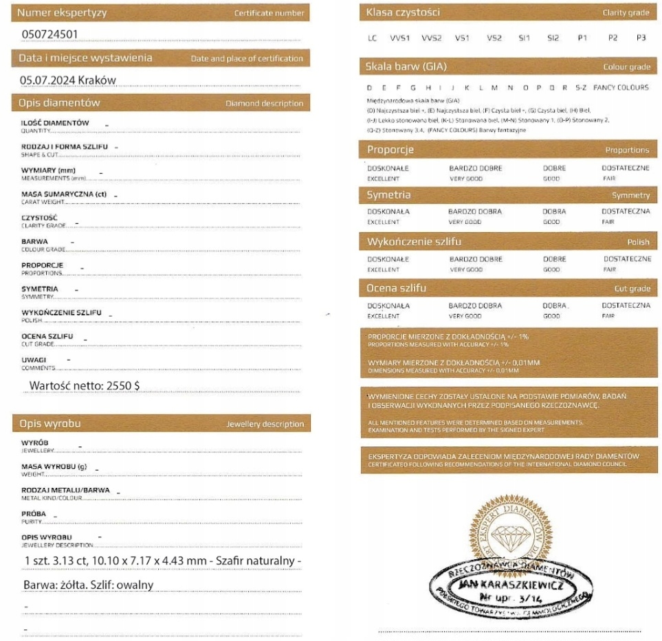 Сапфир сопровождается сертификатом С сертификатомОценщика Польского геммологического общества компании Diamond Sky, работающей на польском рынке 30 лет (в разделе установки обязательных параметров Аллегро сертификат отсутствует на выбор при выборе - другое)