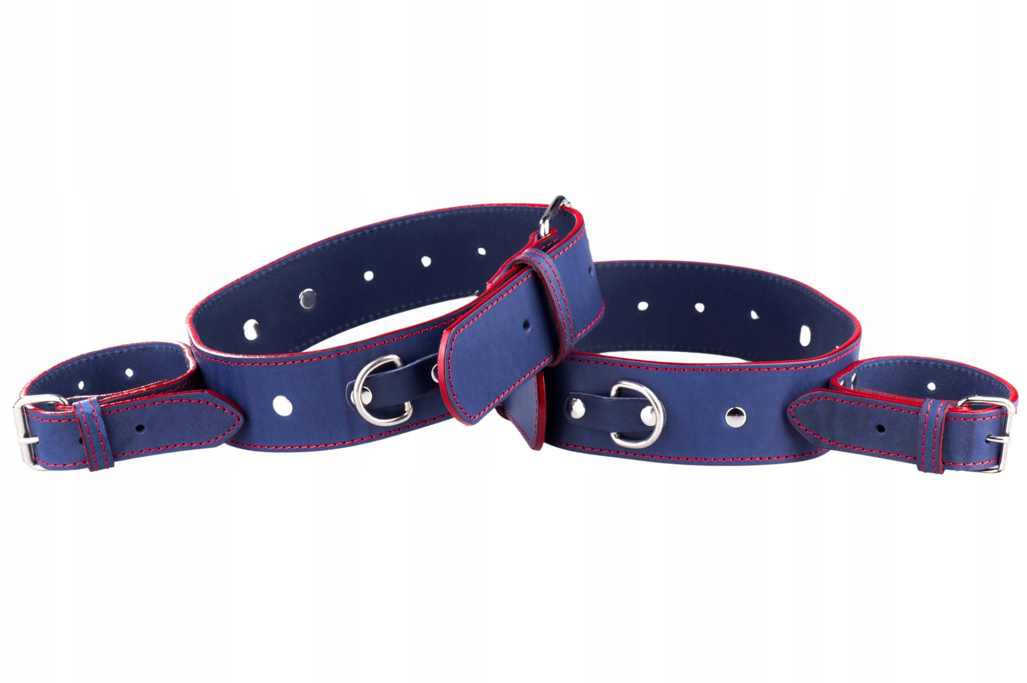 Каждый комплект состоит из 2 широких набедренных ремней, соединенных с более узкими ремнями для рук или лодыжек. Эти элементы прочно соединены с помощью 4 прочных заклепок диаметром 10 мм. Каждый набедренный ремень имеет 2 симметрично расположенных крепления, которые позволят прикрепить дополнительные аксессуары.