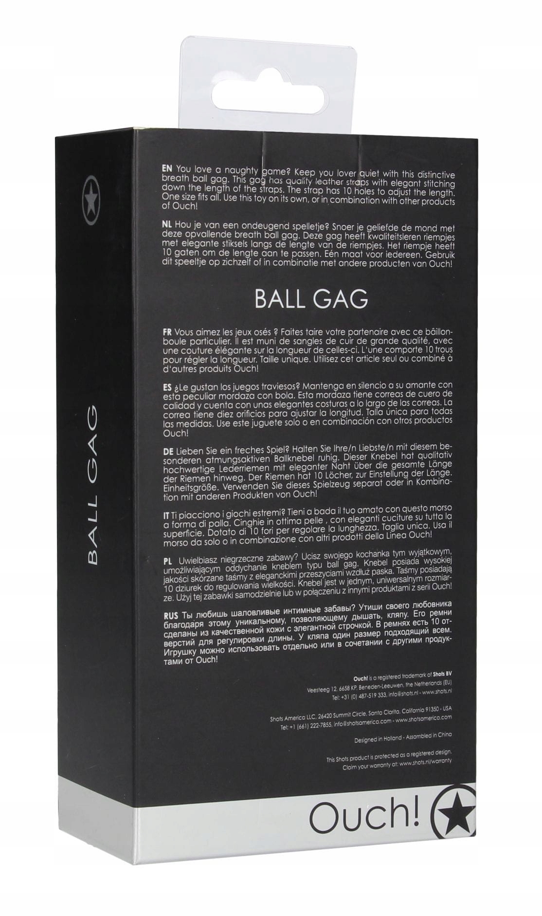 Кляп имеет кожаные ремешки с элегантной строчкой по всей длине ремешка, заканчивающиеся пряжкой и 10 отверстиями для регулировки окружности.