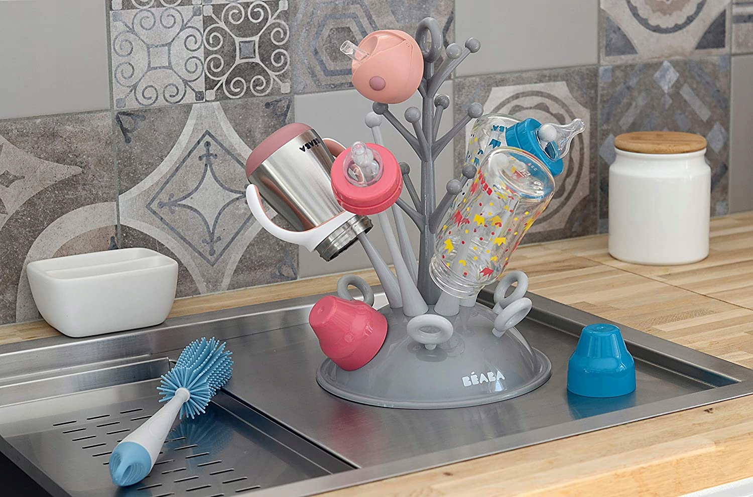 - Практично: позволяет гигиенично сушить детские бутылочки и аксессуары для бутылочек (присоски, завинчивающиеся кольца, крышки...) без намокания поверхности хранения.
