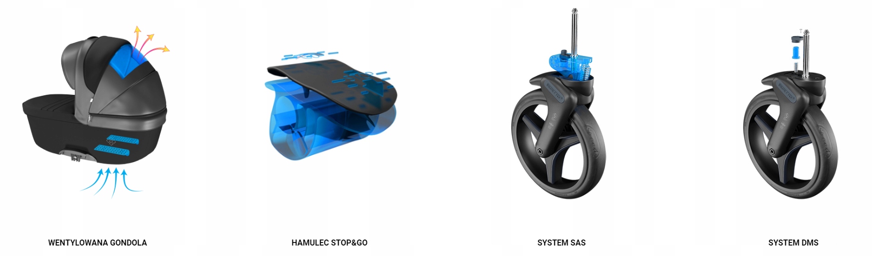 Инновации и функциональность Системы SAS (амортизационное поглощение) в сочетании с мягкой/твердой боковой амортизацией обеспечивает минимизацию вибраций, передаваемых в структуру. DMS, то есть система памяти положения колеса, облегчает запуск тележки.
