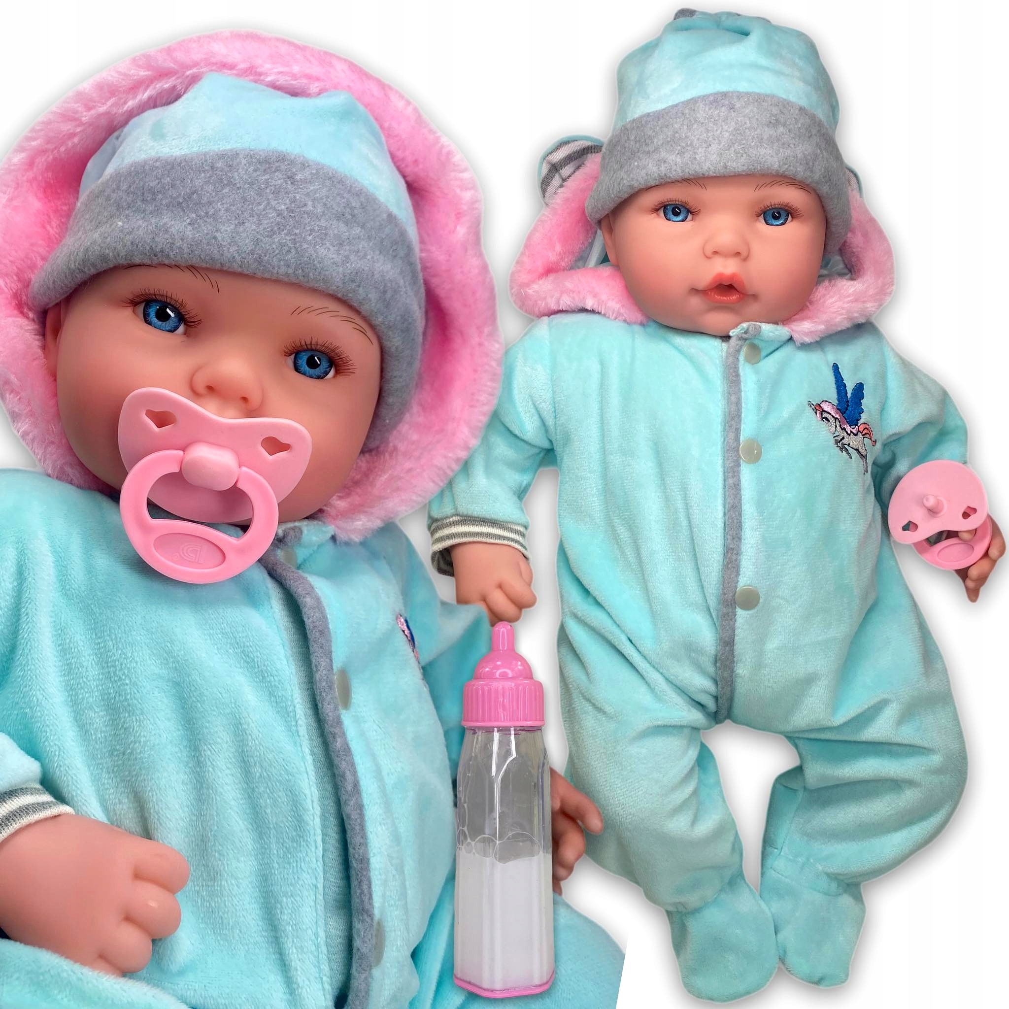 У нее есть милое личико, большие глаза и красивые детские губки. На ней красивый бирюзовый комбинезон с капюшоном, который можно снять и постирать. На голове шапка, которую тоже можно снять.