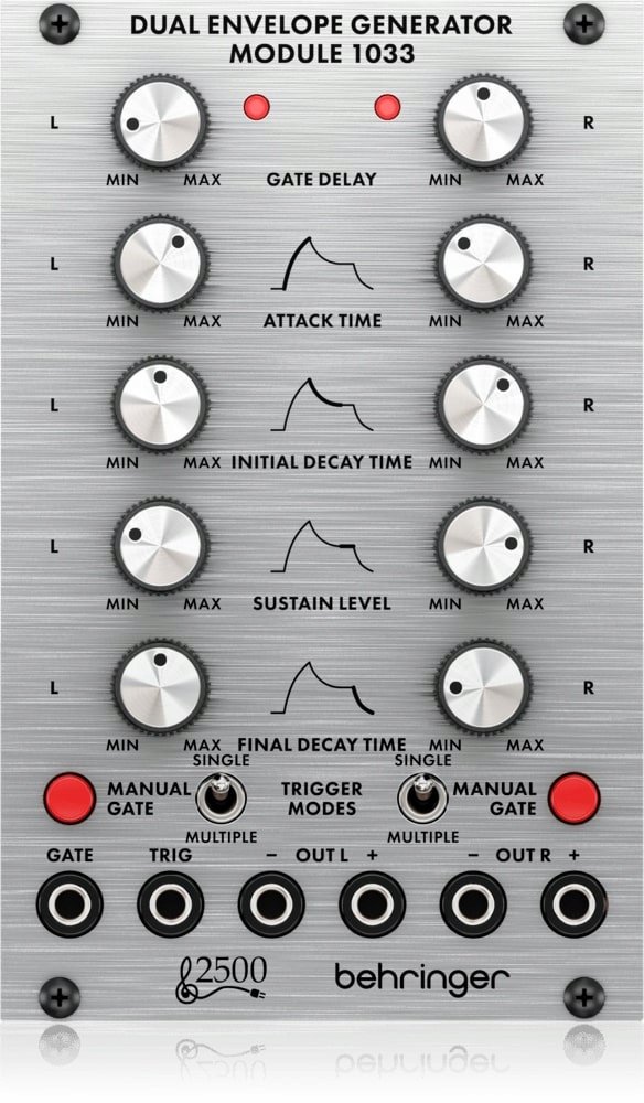 МОДУЛЬ ГЕНЕРАТОРА С ДВОЙНОЙ КОНВЕРТОЙ 1033 серии Behringer 2500 представляет собой аутентичное воспроизведение оригинальной схемы «системы 2500» 1970-х годов, которая помещается в стандартный корпус евростойки. Модуль 1033 позволяет создавать глубоко обработанный сигнал с 10 ручками для независимого управления задержкой гейта, временем атаки, начальным затуханием, сустейном и окончательным затуханием. Создавайте визгливые и ударные звуки или долго развивающиеся паттерны, идеальные для фанк-грува или мрачного саундтрека к новейшему стилю киберпанка.