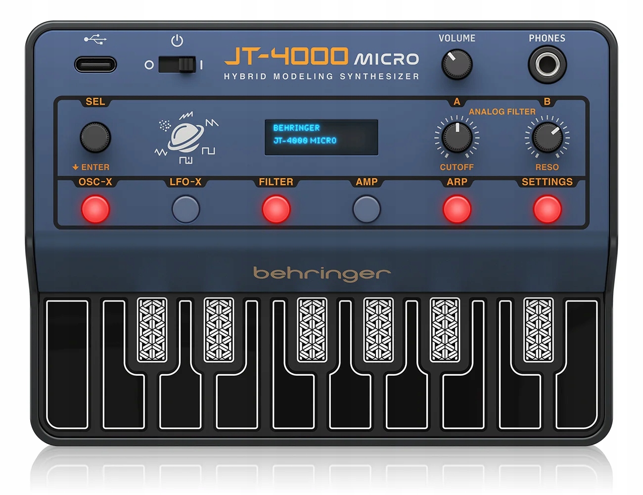 Behringer JT-4000 MICRO – портативный гибридный четырехголосный синтезатор с двумя аналоговыми генераторами, формирующими каждый голос отдельно, со встроенным аналоговым фильтром и арпеджиатором.
