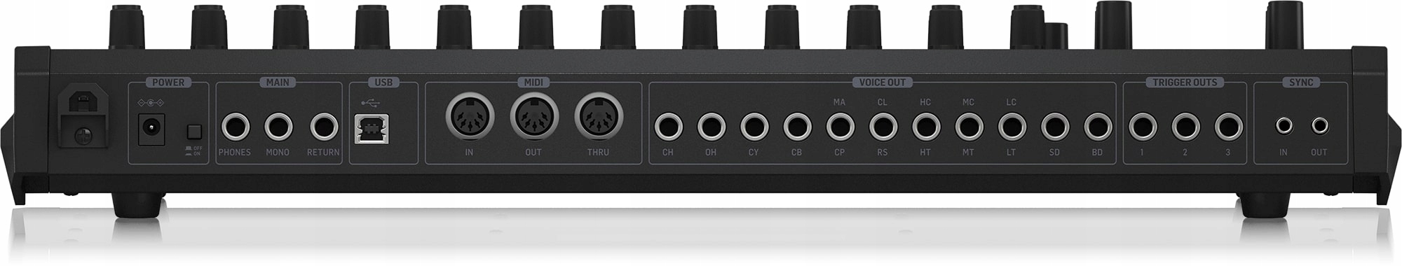- 11 независимых аналоговых выходов для внешней обработки или записи ритмов в виде многодорожечного звука.