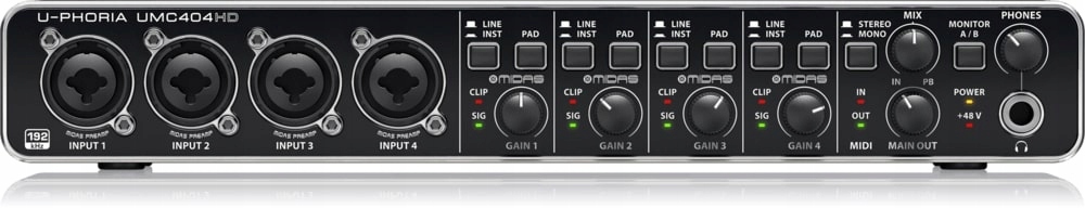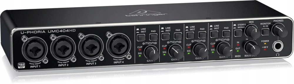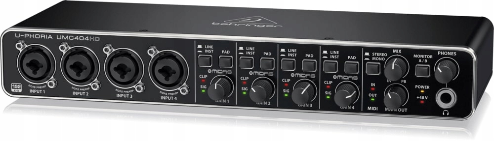 BEHRINGER U-PHORIA UMC404HD — Аудиофильский уровень, интерфейс высокого разрешения 24 бит/192 кГц 4 x 4 USB Audio/MIDI. Предусилители MIDAS, предназначенные для записи микрофонов и инструментов.