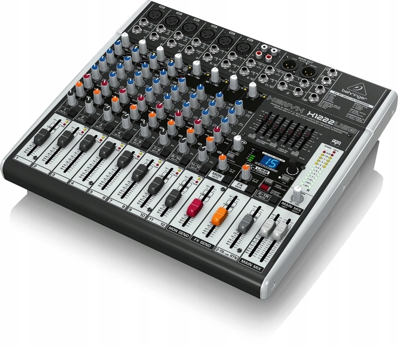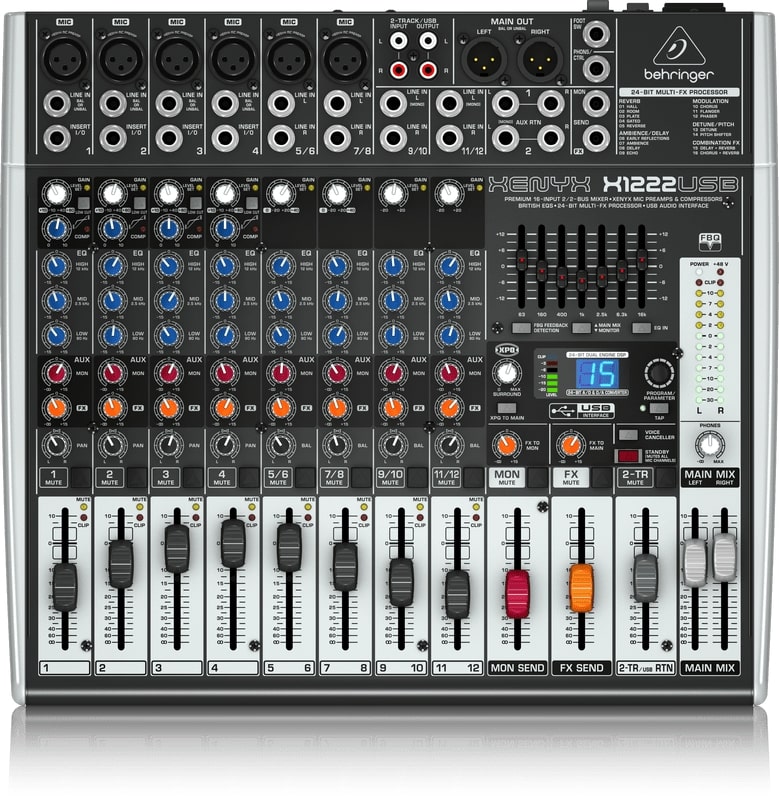 BEHRINGER XENYX X1222USB — 16-канальный микшер с 2/2 подгруппами, микрофонными предусилителями XENYX, компрессорами, классическим «британским» эквалайзером, 24-битным процессором эффектов и аудиоинтерфейсом USB.
