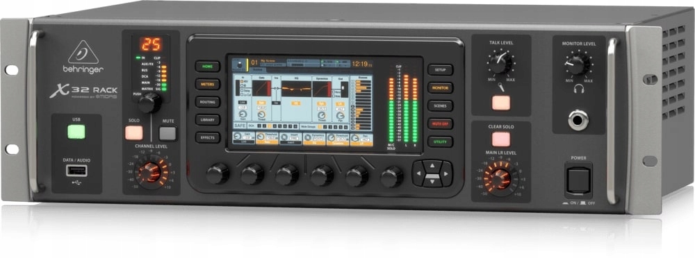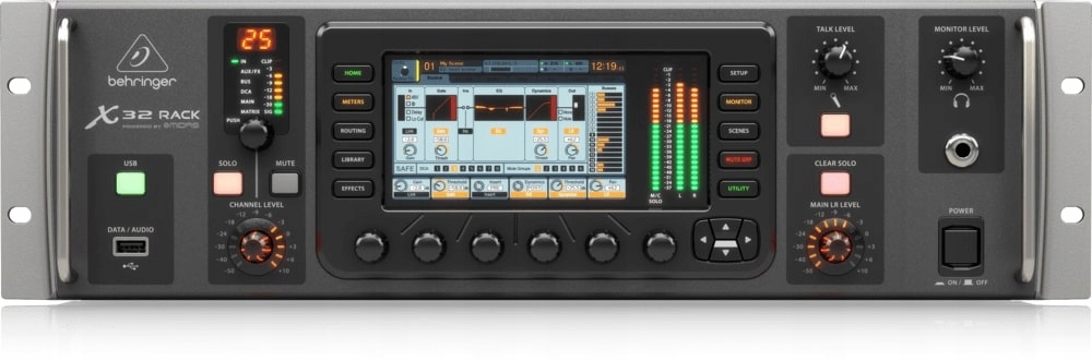 BEHRINGER X32 RACK — цифровой микшер с поддержкой 40 входных каналов; 25 направляющих в стоечном корпусе высотой 3U, предназначенном для живых приложений и установок.