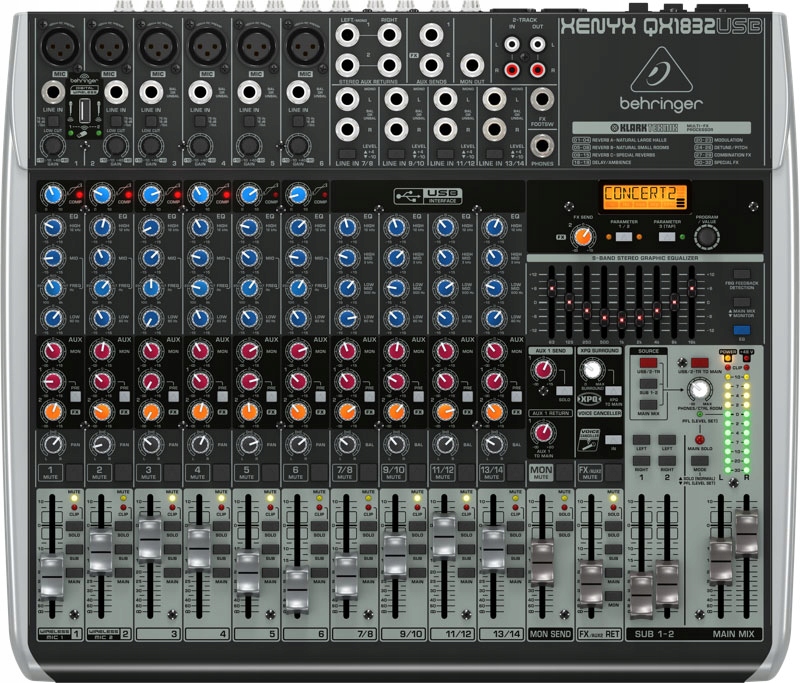 Сверхмалошумящий аналоговый микшер XENYX QX1832USB с процессором KLARK TEKNIK FX, с 6 микрофонными предусилителями XENYX и индивидуальным фантомным питанием.