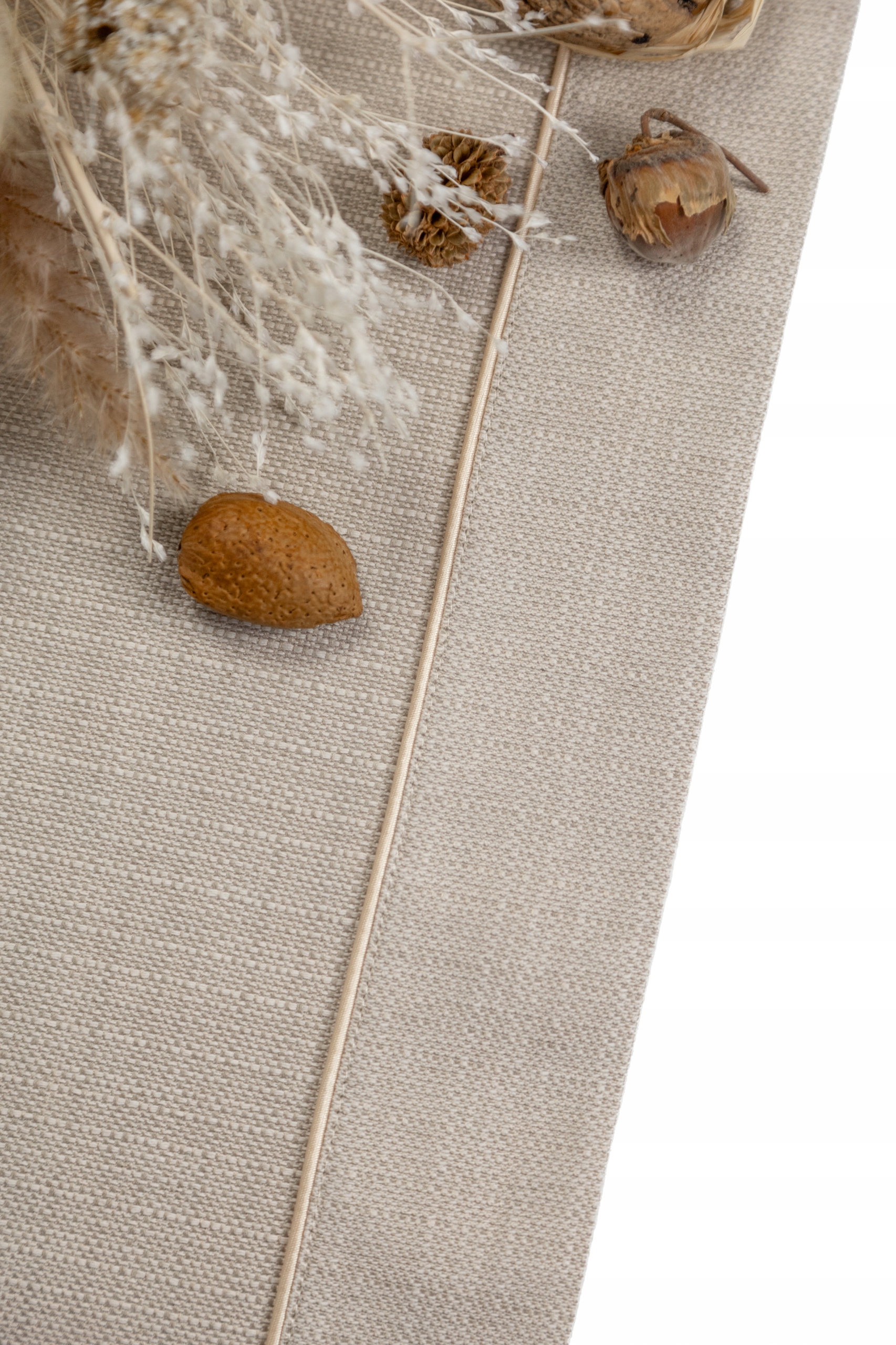 Эксклюзивная, плотная скатерть с видимым утолщением ниток для современных интерьеров с душой, украшенная элегантной манжетой/полоской с вшитым тонким, атласным, нежным кантом цвета капучино.