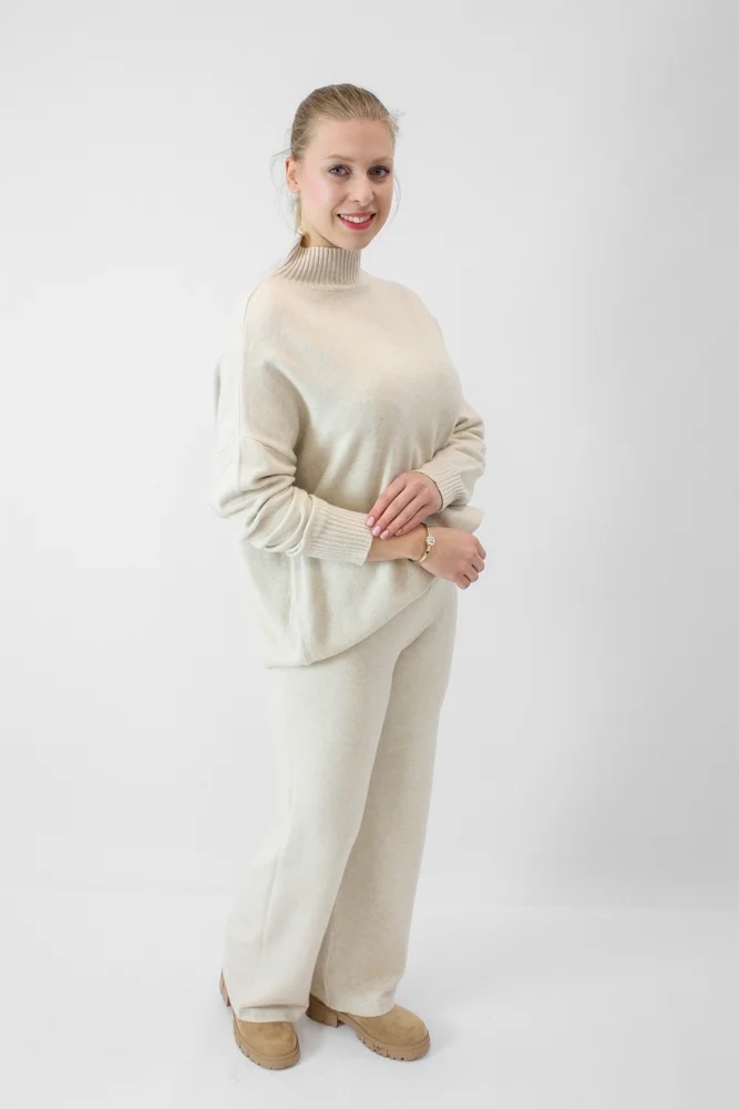 Мягкий на ощупь материал обещает не только стиль, но и удовольствие от ношения. Свитер с высоким воротником и прямые брюки без карманов создают целостный комплект, который будет хорошо смотреться как в повседневных ситуациях, так и на выходах, когда вы хотите чувствовать себя комфортно и модно. Прямые брюки с эластичным поясом – предложение для женщин, которые ценят свободу движений, не жертвуя при этом элегантностью.