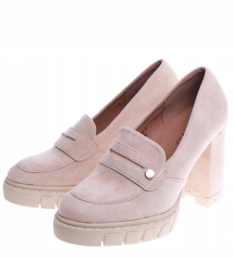 - Модные туфли на высоком каблуке из экологической замши бежевого цвета.