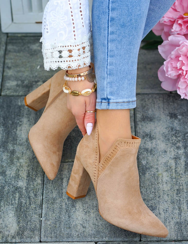 Элегантные женские ботильоны бежевого цвета (хаки). Туфли полностью изготовлены из мягкой эко-замши. Устойчивый широкий каблук обеспечивает комфорт при ношении, а вырез на щиколотке придает обуви уникальный вид. Верх имеет тонкий ажурный принт по краям.