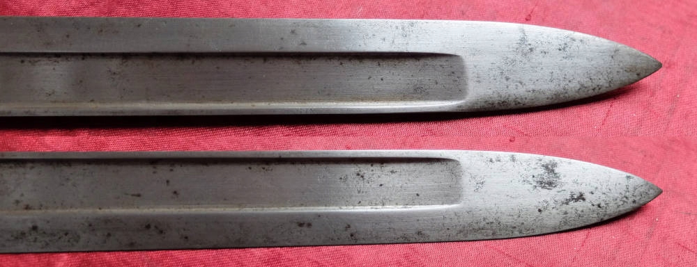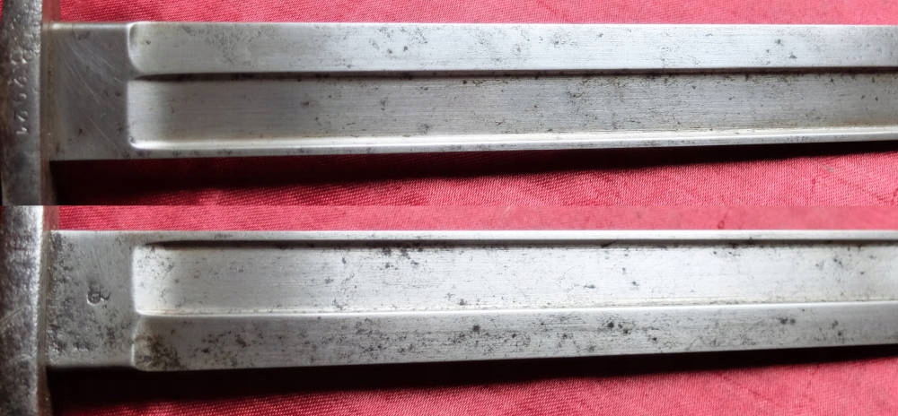 Экземпляр, видимый на фотографиях, хорошо сохранился. Лезвие не заточено. На пороге лезвия имеется небольшая отметина. НомерB 2921 на цевье. Байонетный замок рабочий. Накладки рукояти оригинальные, деревянные.