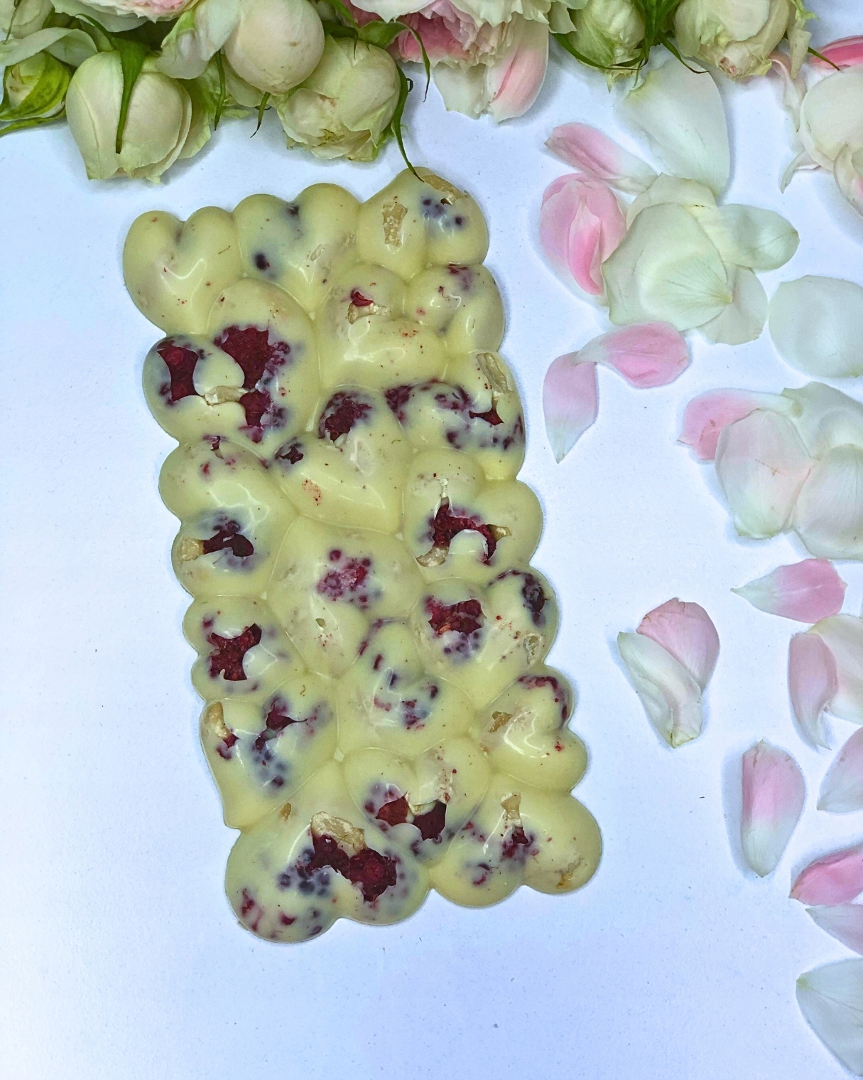 Состав: Белый шоколад (сахар, какао-масло, цельный порошок МОЛОКО, эмульгатор: СОЕВЫЙ лецитин, натуральный ванильный ароматизатор), пищевой краситель, лиофилизированная малина, арахис.