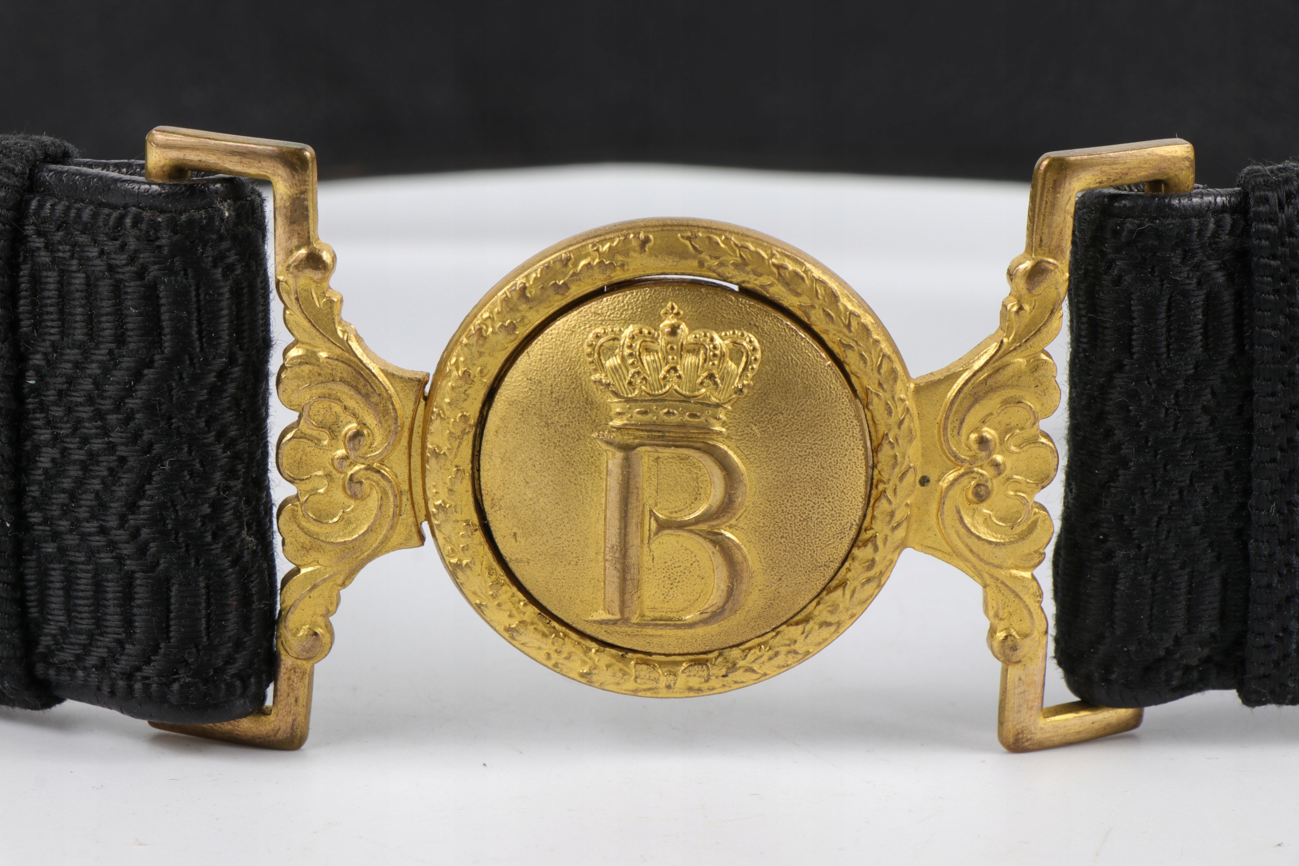 Бельгийский парадный военный ремень с позолоченной пряжкой и инициалом короля Бельгии Болдуина I. Ремень снаружи тканевый, снизу кожаный. Размер 85 выбит на внутренней стороне кожи.
