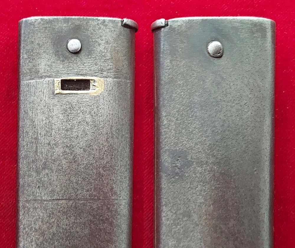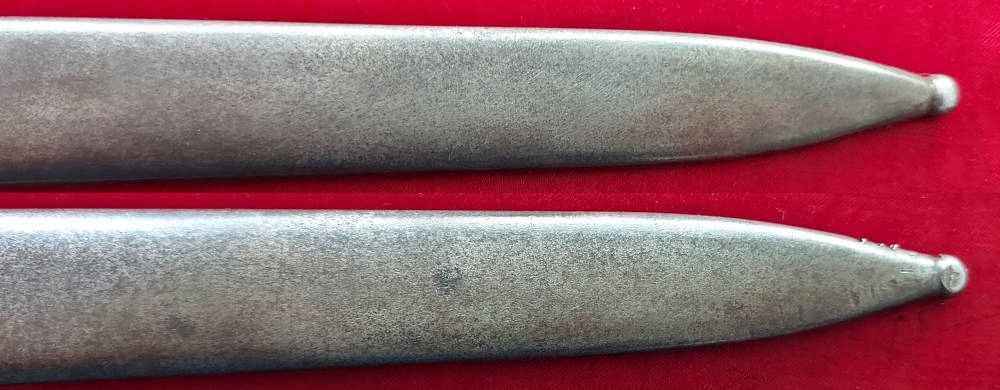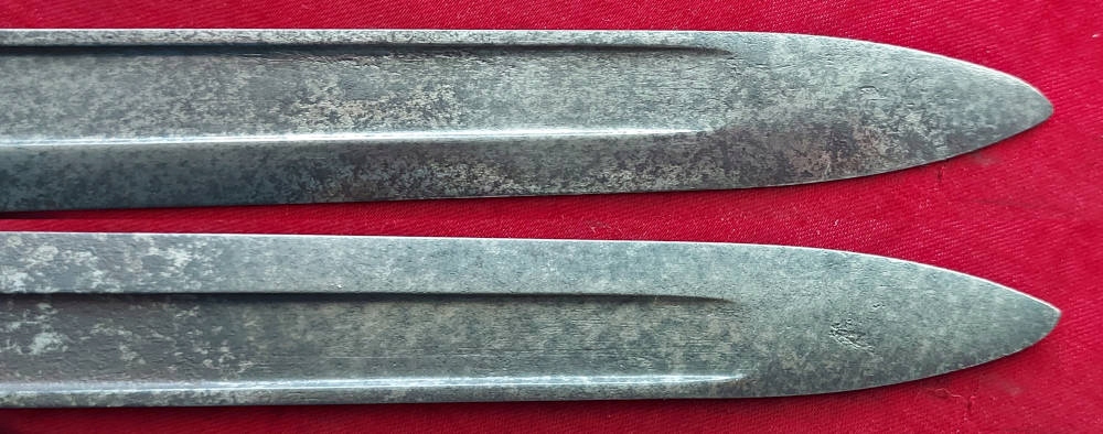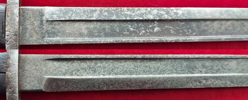 Экземпляр, видимый на фотографиях, хорошо сохранился. Клинок неполированный, покрыт поверхностной коррозией и имеет темные пятна. На пороге лезвия имеется небольшая отметина. Накладки на ручки изготовлены из натурального дерева. У одного есть видимые повреждения. Байонетный замок рабочий. На перекладине выбит едва заметный номер.
