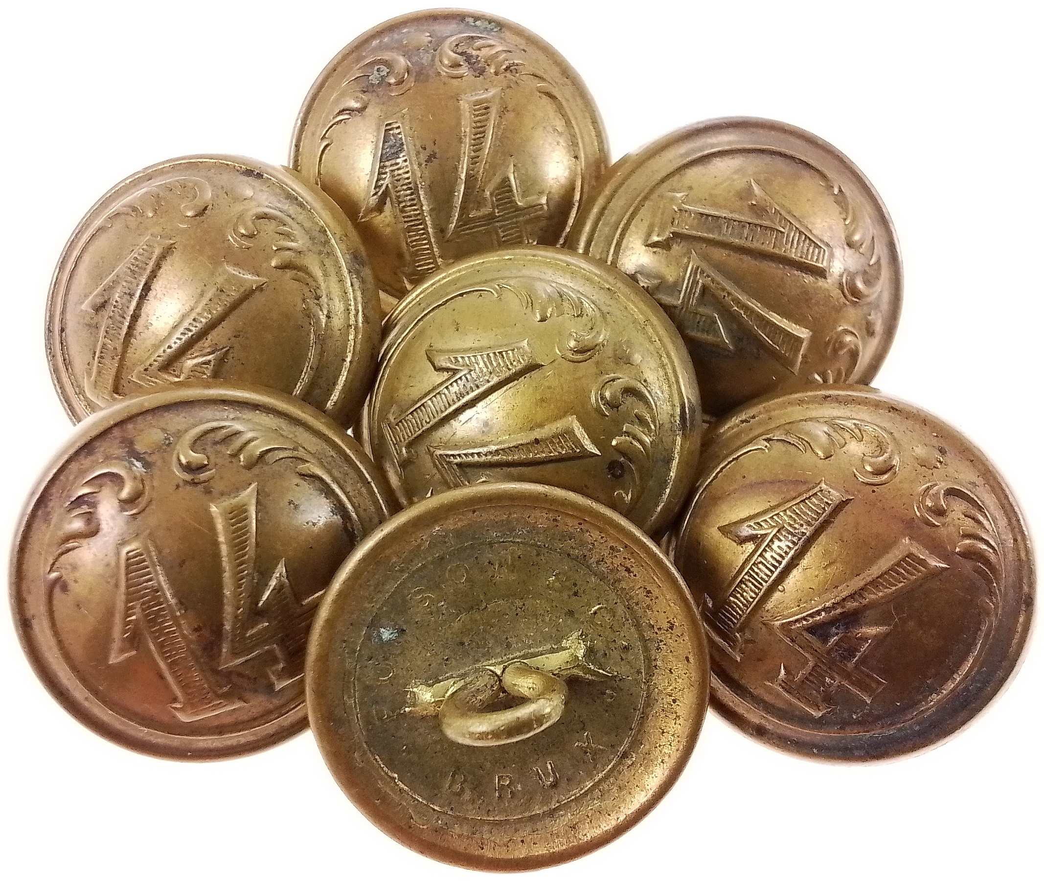 Бельгийские кнопки в форме, определяющие принадлежность к линейному пехотному полку 14, подходящие для периода Первой мировой войны, обратно подписано с именем производителя, медного.