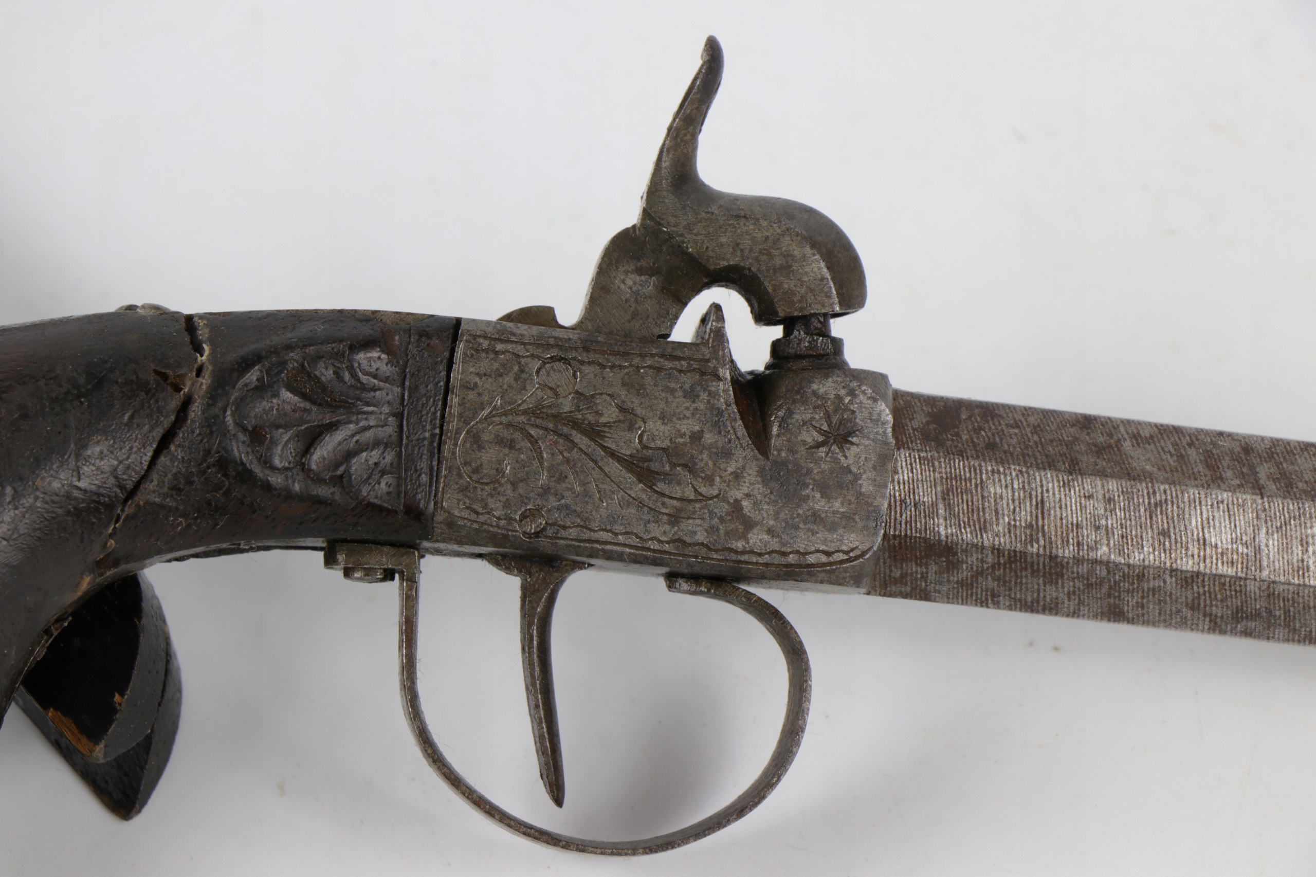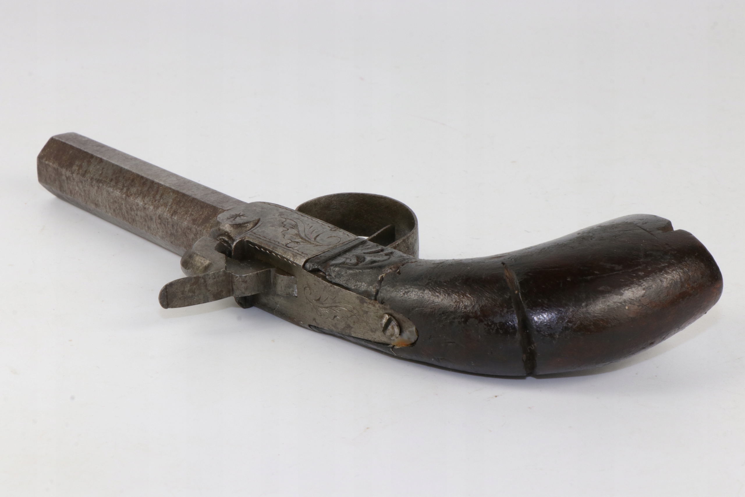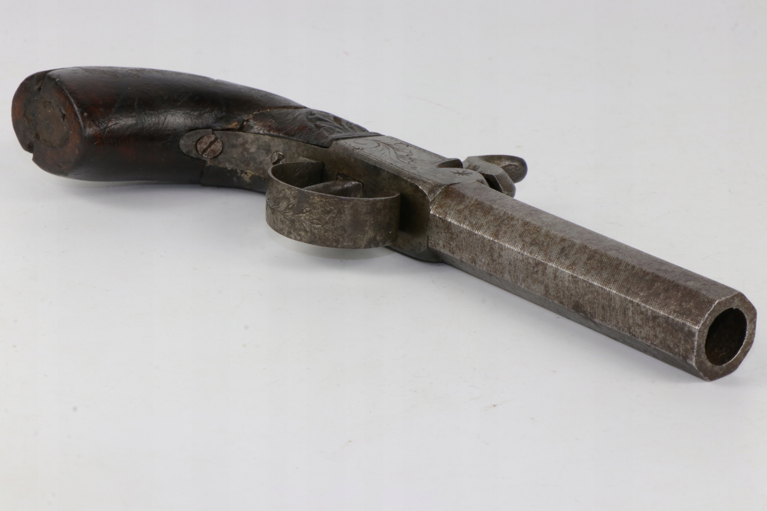 Пистолет с черным и порошковым пистолетом. Пистолет, украшенный очень хорошей гравировкой, восьмиугольной бочкой с характерным фризом. Эффективный замок. > Материал : stal