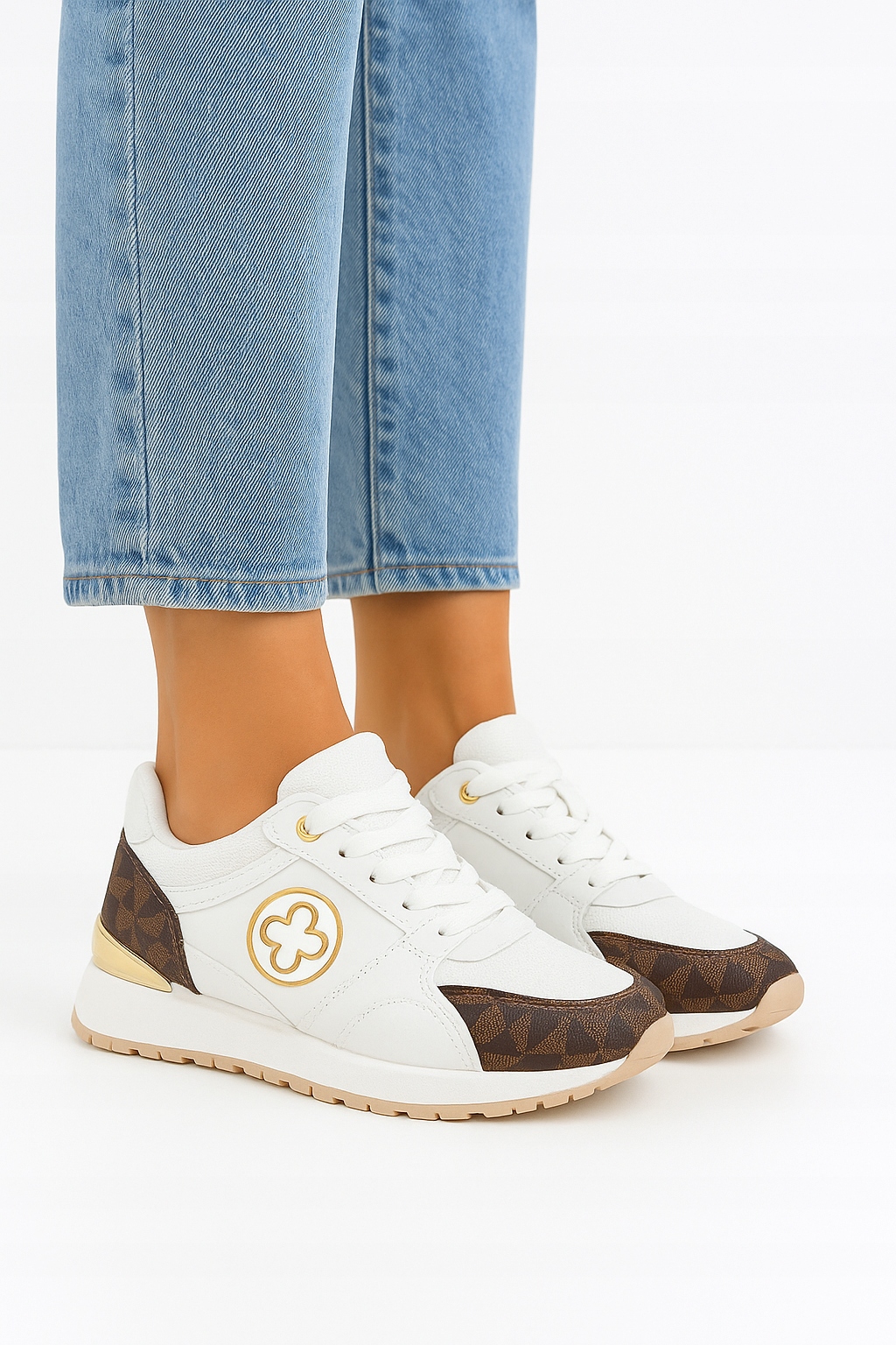 Белые женские спортивные туфли на шнуровке. Изготовлен из материалов хорошего качества. Они идеальны в качестве повседневной обуви. Они легкие и обеспечивают удобство и комфорт использования. Поднятая, устойчивая подошва хорошо амортизирует ногу.