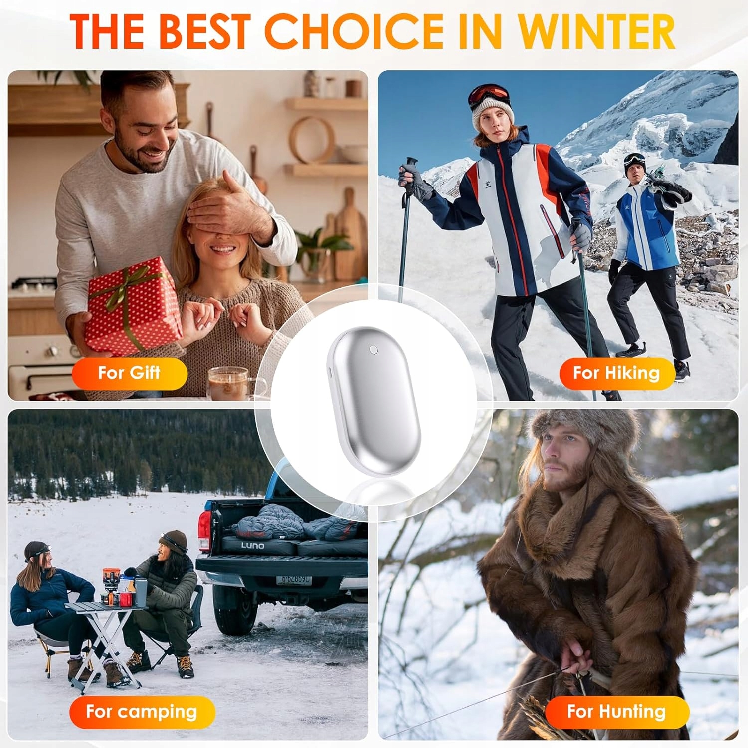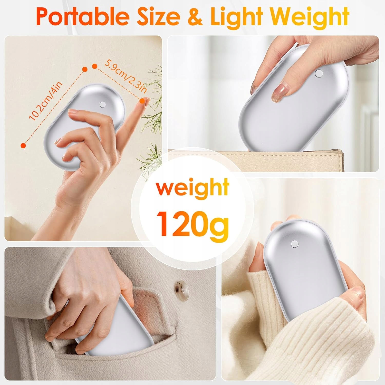 【Безопасный и портативный】Эта грелка для рук оснащена повышенной безопасностью, оптимизированной и улучшенной схемой, обеспечивающей длительный срок службы и предотвращающей чрезмерную разрядку, перезарядку, перегрев и короткое замыкание, а также автоматически отключает питание, когда температура достигает 60 ° C. Он весит всего 120 г и по размеру равен половине смартфона, что делает его очень удобным