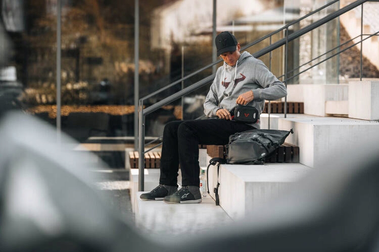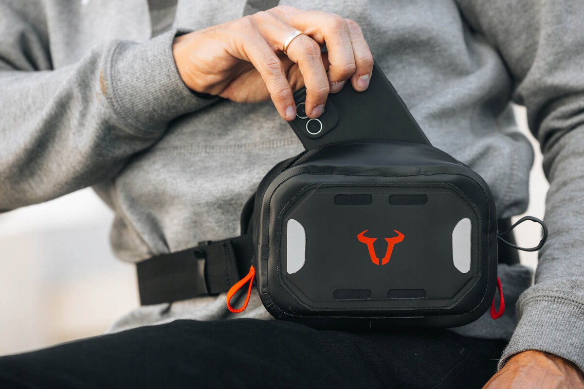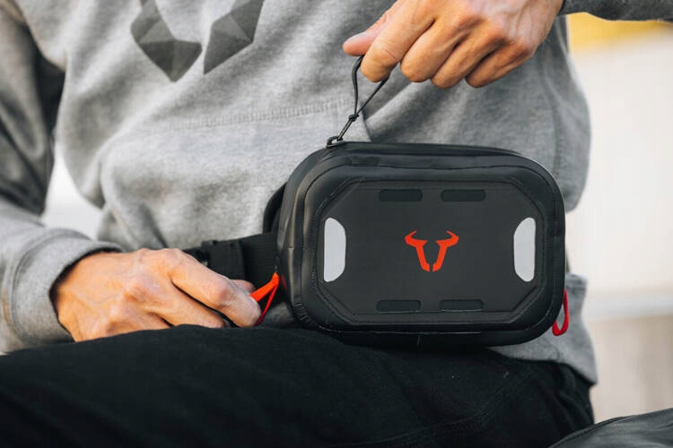 Эта стильная сумка, новая версия в полностью водонепроницаемой версии, станет подходящим аксессуаром для любого приключения на мотоцикле и для всех мотоциклистов, которым нравится, чтобы их вещи, такие как смартфоны, кошельки и документы, были всегда под рукой благодаря продуманному расположению. Эти предметы первой необходимости надежно хранятся в эластичном сетчатом кармане внутри сумки. Прикрепляясь к талии с помощью щелчка, сумку можно носить посередине, на боку или против хода движения. Его также можно прикрепить к собственному ремню. Ваши личные ценности надежно защищены независимо от погоды.