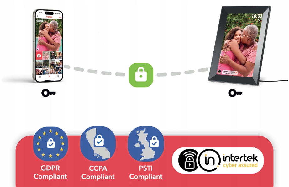 Приложение Frameo использует технологию Secure Device Grid (SDG) для получения комплексного шифрования и безопасности, которые обеспечивают конфиденциальность и безопасность фотографий.