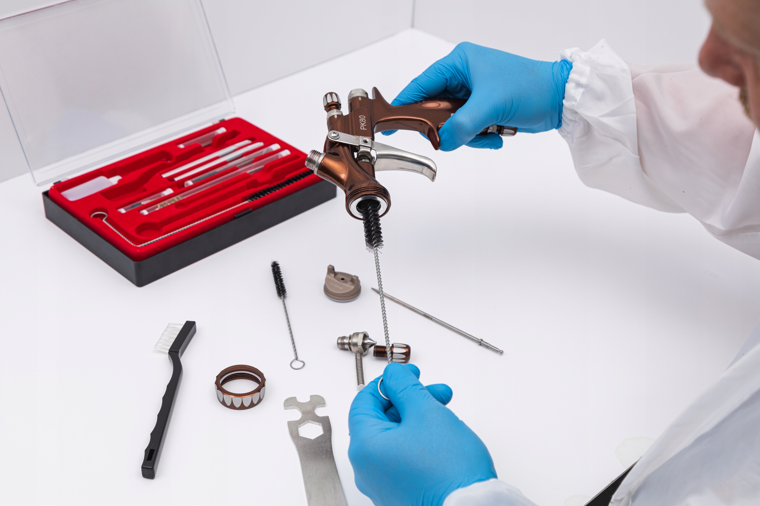 Набор можно использовать для чистки корпуса пистолета, сопла сопло для подачи воздуха и краски, а также все детали, несущие материал, пистолета. Отверстия в воздушной крышке также можно легко очистить с помощью прилагаемых игл.