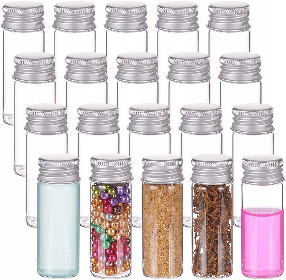 В комплект входят: 20 упаковок стеклянных флаконов по 12 мл с алюминиевыми крышками, диаметром около 2,2 см, высотой 6,1 см, флакон высотой 6 см, внутренний диаметр 1,4 см, шляпка: 2,2 х 1,2 см, маленькая и портативная.